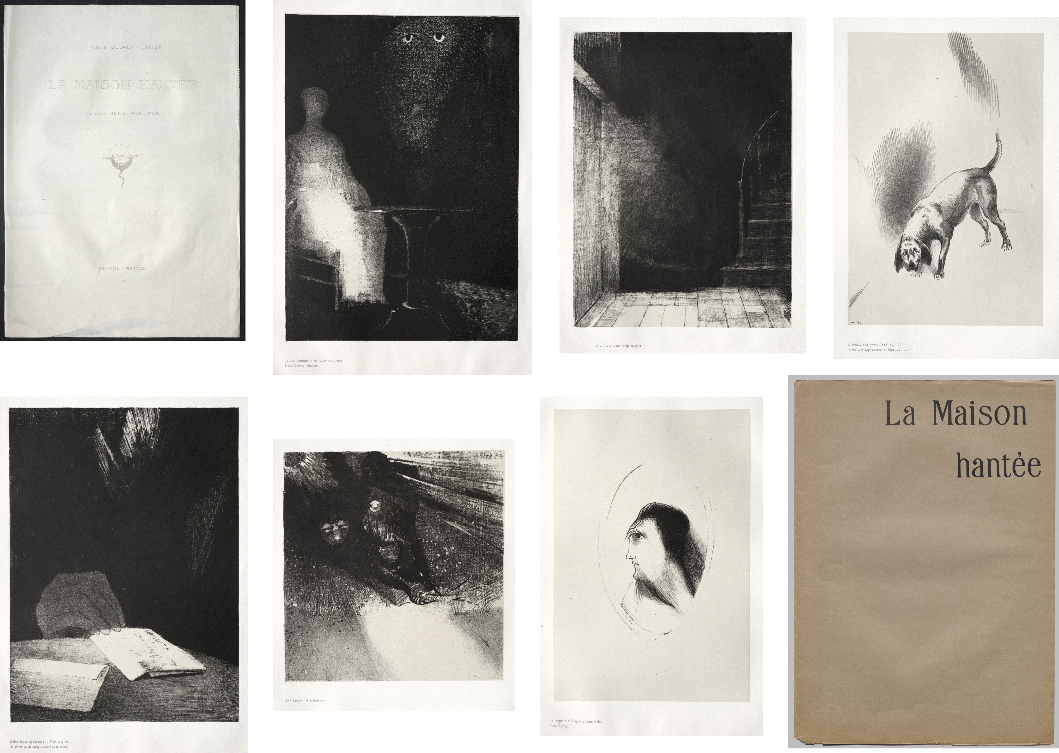 Eight black and white artworks and one brown book cover arranged in a grid. Top row, left to right: - A white page with a black border, illegible text printed on it and a small bird-like drawing; - A sitting figure on a chair in front of a dark table with eyes looming; - A dimly lit room with a staircase; - A dog lowering its head. Bottom row, left to right: - A hand resting on papers on a dark table; - A profile of two people in the dark; - A woman's head profile; - A brown book cover with "La Maison hantee" printed on it. The artworks are by Odilon Redon and titled "The Haunted House".
