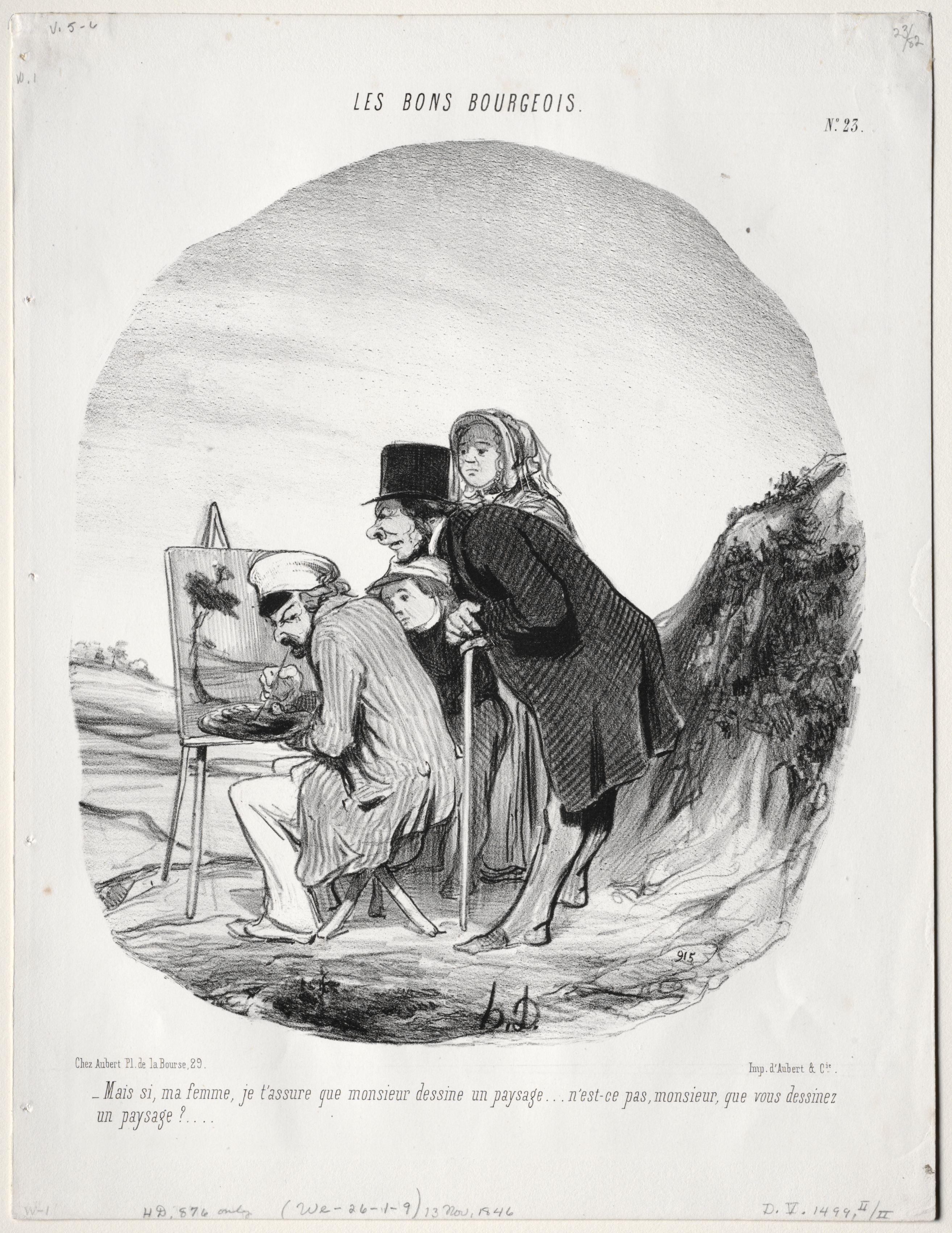 Black and white drawing. Man seated on stool at easel facing left, painting landscape. Man wearing white hat with wide brim, striped shirt, striped robe. Bare feet. Easel on left with canvas showing landscape. Two people standing behind him on right. Man wearing top hat and coat. Woman wearing headscarf and long coat. The three people are under large half circle. French text above circle: "Les Bons Bourgeois. No 25". French text below circle. Small text on top left and right corners and bottom.