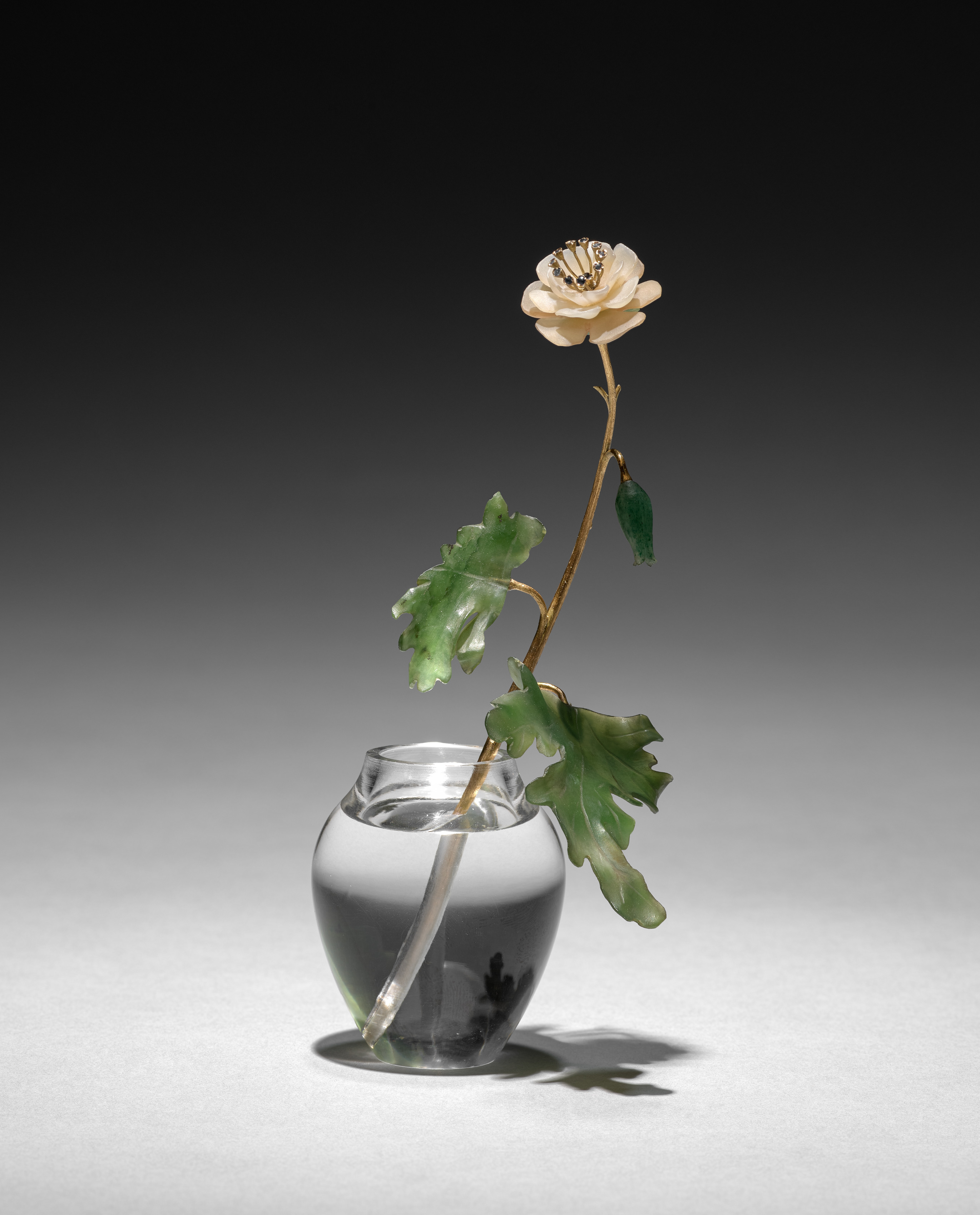 The image shows a glass vase with a flower and leaves. The vase is clear and has a rounded body with a narrow opening at the top. It appears to be made of glass or crystal. The vase contains water and a single stem with green leaves and a white flower on top. The flower has a gold center. The background is a gradient from dark gray at the top to light gray at the bottom. The overall atmosphere suggests that this is a still life photograph. The flower study depicts an anemone by Henrik Wigström.