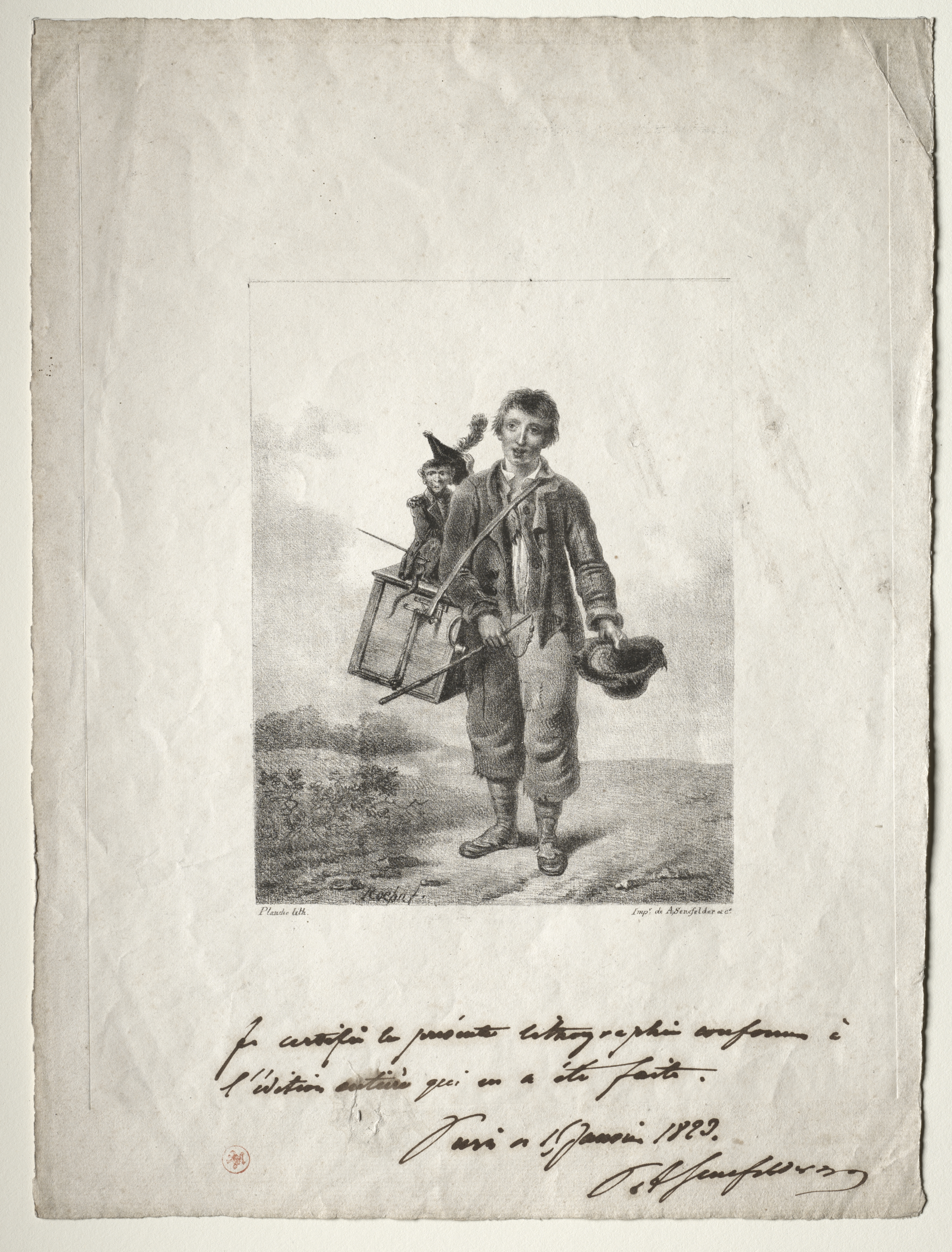 Black and white image of a young boy standing on a dirt path. The boy has short hair and wears a jacket, suspenders, and loose-fitting pants tucked into boots. He holds a hat in one hand and a music box or organ in the other. A monkey sits on top of the music box. The background shows trees, bushes, and a cloudy sky. The image is on aged paper with writing at the bottom.
