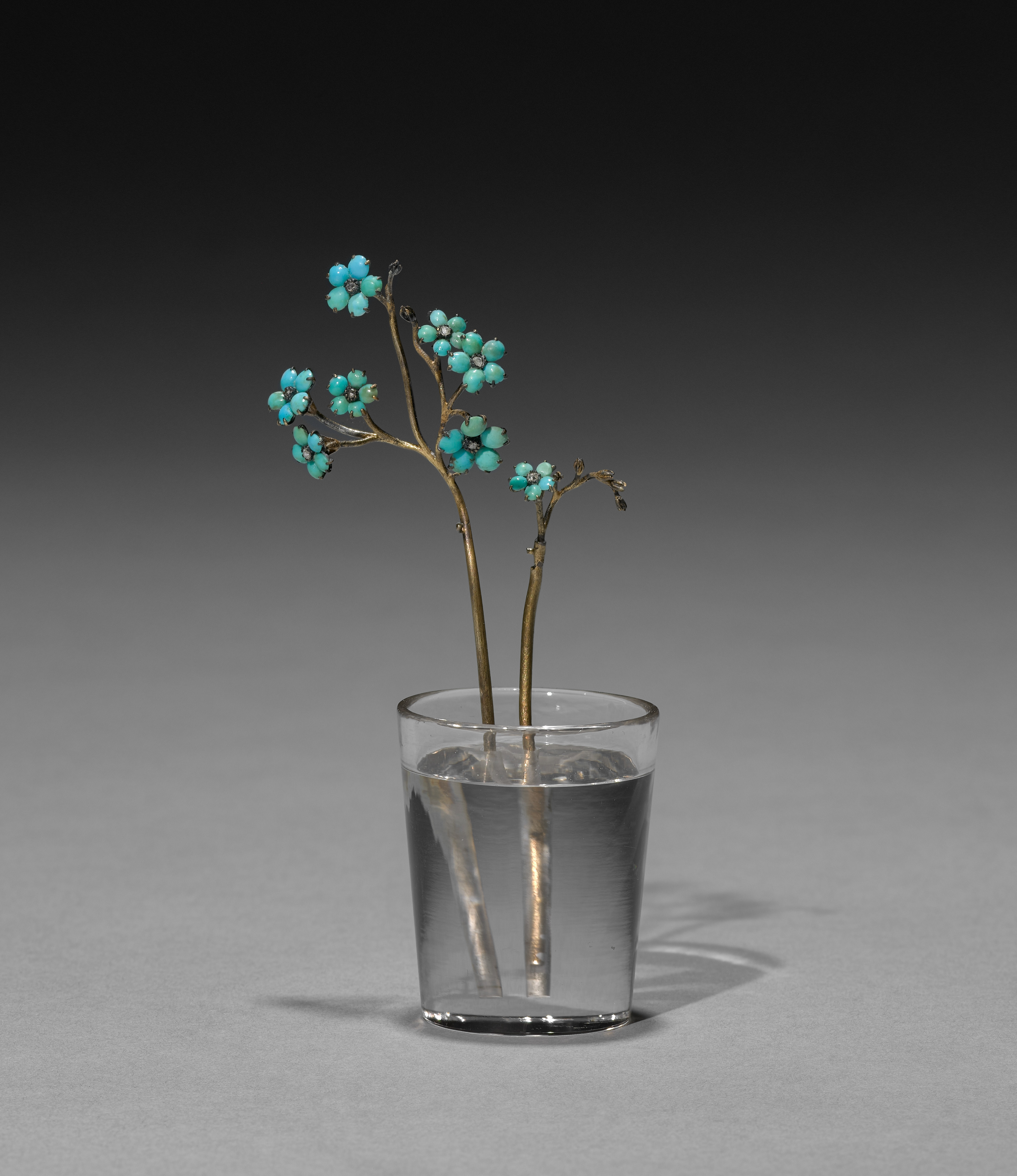 Clear glass cup with a wide mouth and straight sides, containing water and two thin gold stems with small clusters of five-petaled turquoise flowers with black centers.