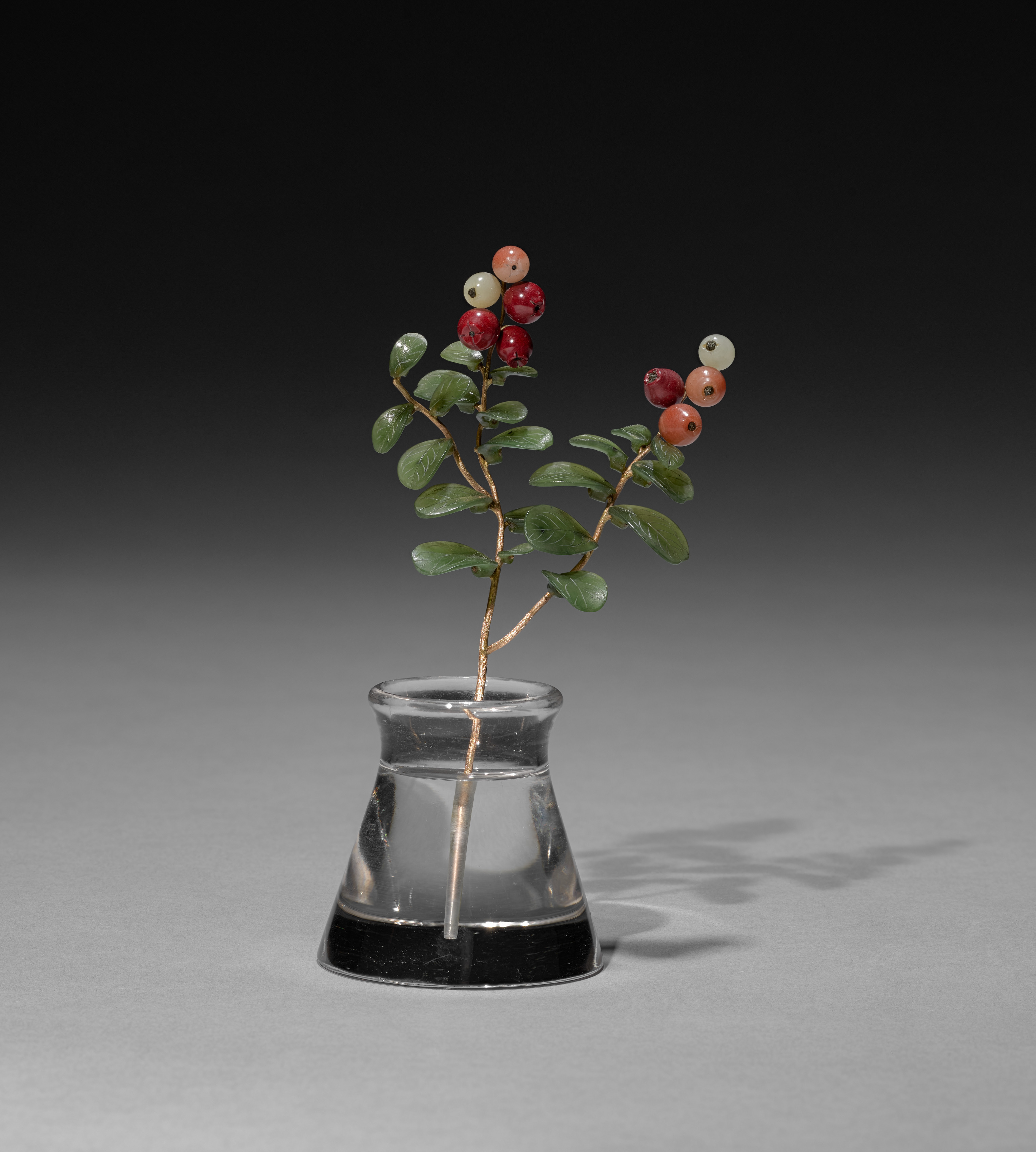 Clear glass vase with a wide mouth, narrow neck, and flared base containing water and a single stem with green leaves and clusters of small, round berries in shades of red and white. The berries have a small hole at the top. The background is a gradient from black at the top to gray at the bottom. The object casts a shadow to the right.