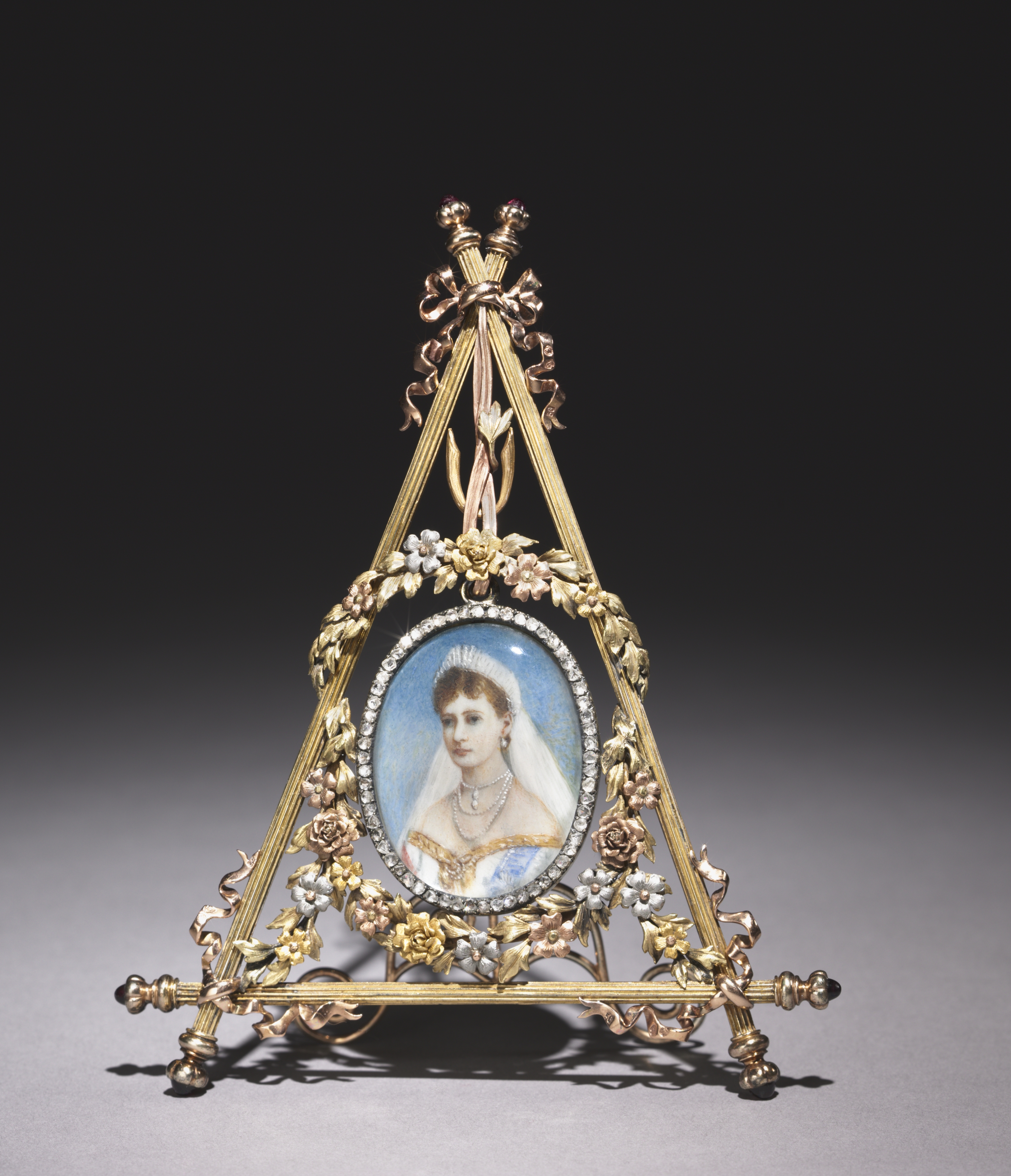 Gold-colored metal frame standing in a triangular A-frame fashion with feet at each corner; frame decorated with engraved floral designs and clear stones; framed portrait centered; portrait on a blue background; portrait of woman with fair skin and light brown hair wearing white veil, blue dress with gold trim, pearl necklace, and earrings; woman wearing a tiara; frame encircled by clear stones. The framed miniature is by House of Fabergé and depicts Tsarina Alexandra Feodorovna.