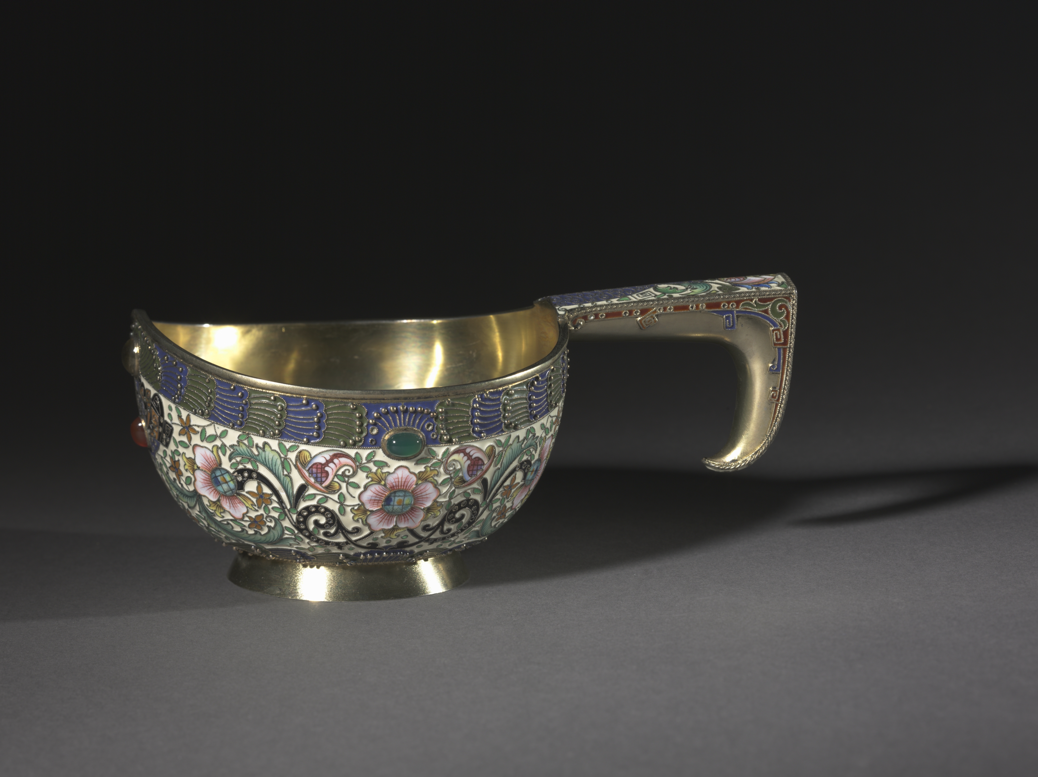 The object is a kovsh, a type of cup. The kovsh has a handle on one side and sits on a short base. The interior of the kovsh is gold-colored. The exterior features intricate designs with floral patterns and colors including pink, blue, green, red, and white. The kovsh has two small decorative protrusions on either side, below the rim. The kovsh's exterior rim and handle have a gold-colored finish with a decorative edge. The handle is curved and tapers towards the end. The background of the image is dark gray.