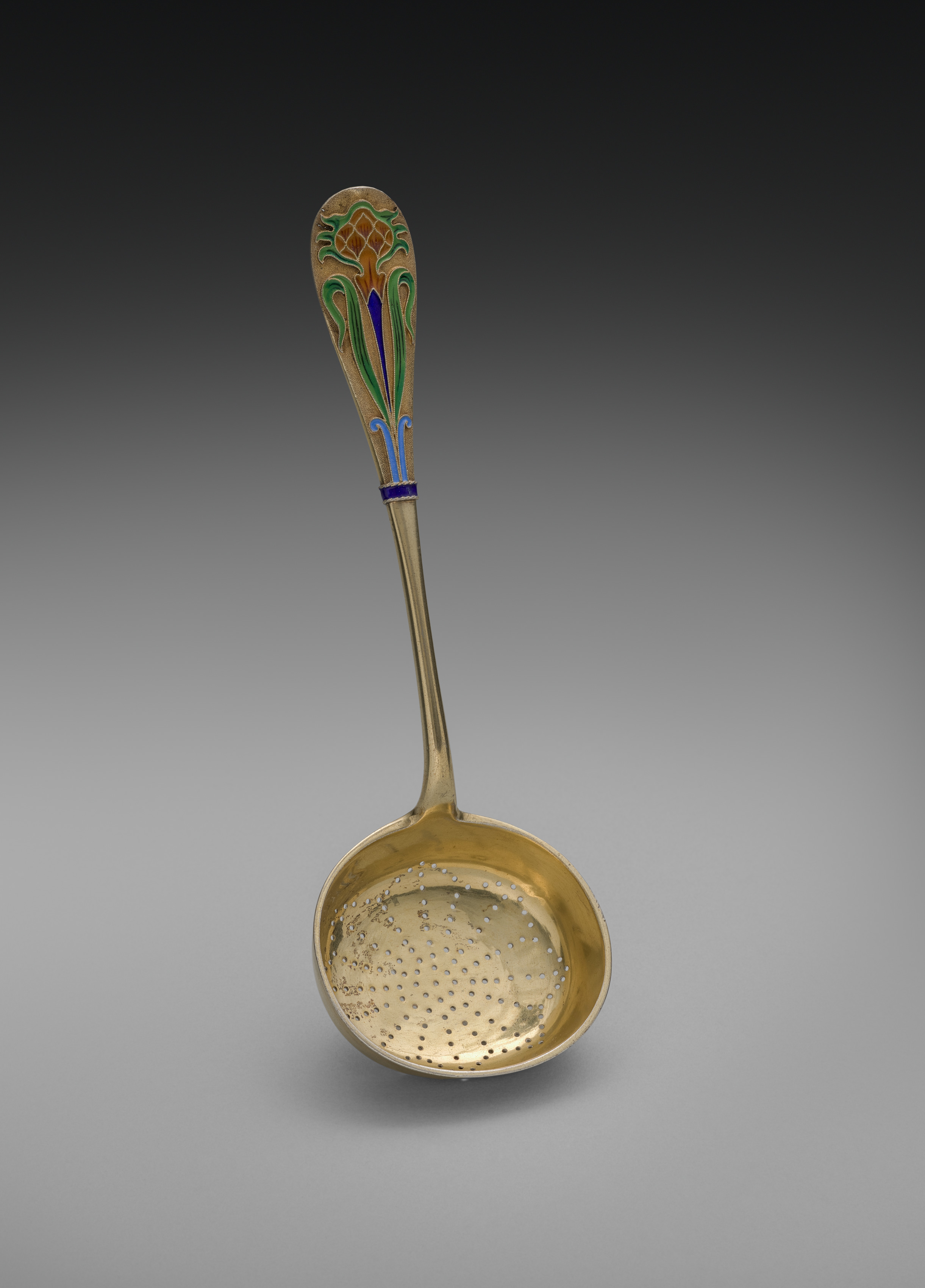 Tea Strainer by Feodor Ivanovich Rückert: A gold tea strainer with a long handle and a bowl featuring numerous small holes, the handle decorated with green, blue, and orange enamel designs.