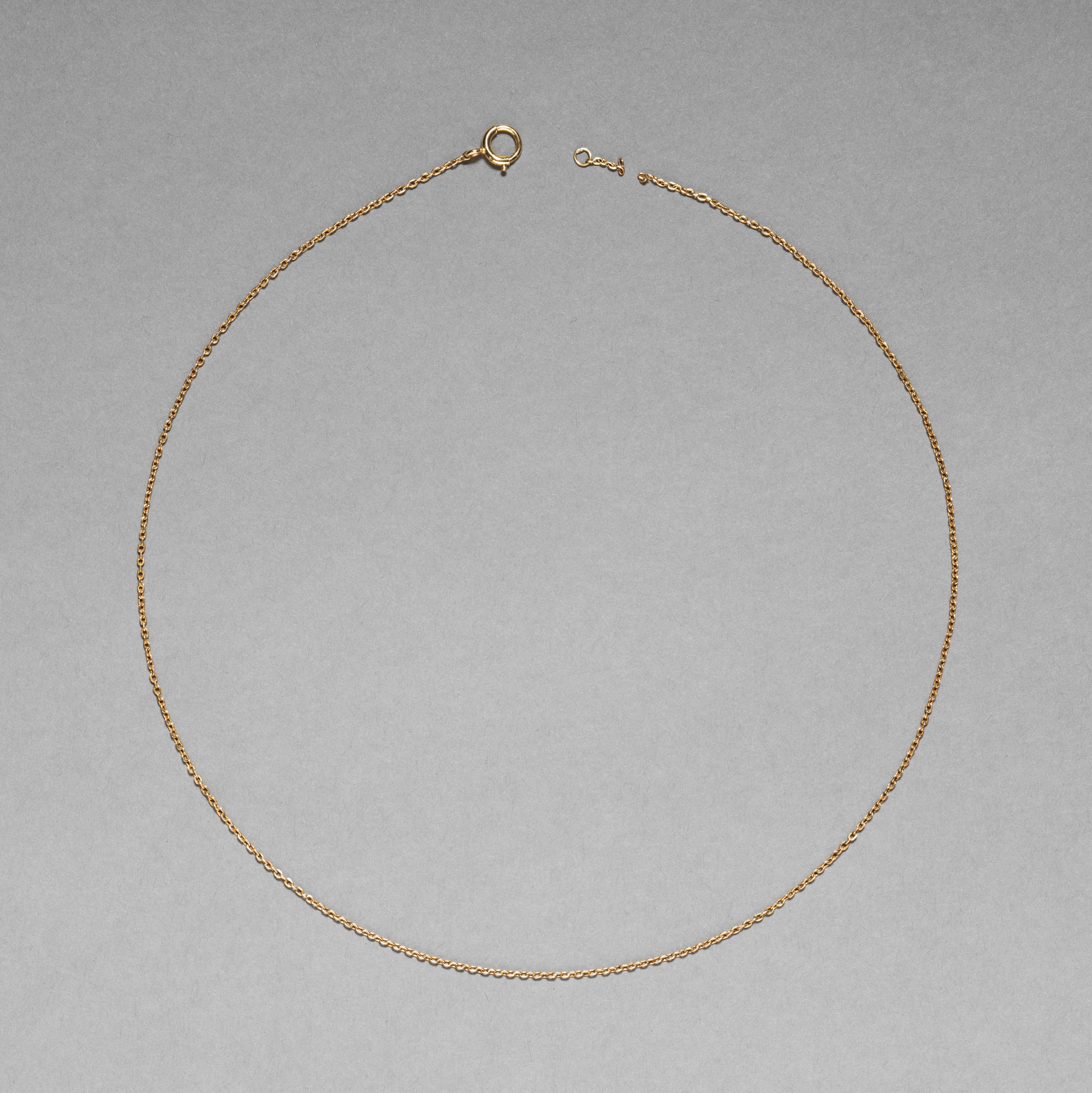 Gold chain for pendant, thin gold chain with small interlocking loops forming the chain, gold clasp at one end and a small gold piece likely for adjusting length at the other end, on a gray background.