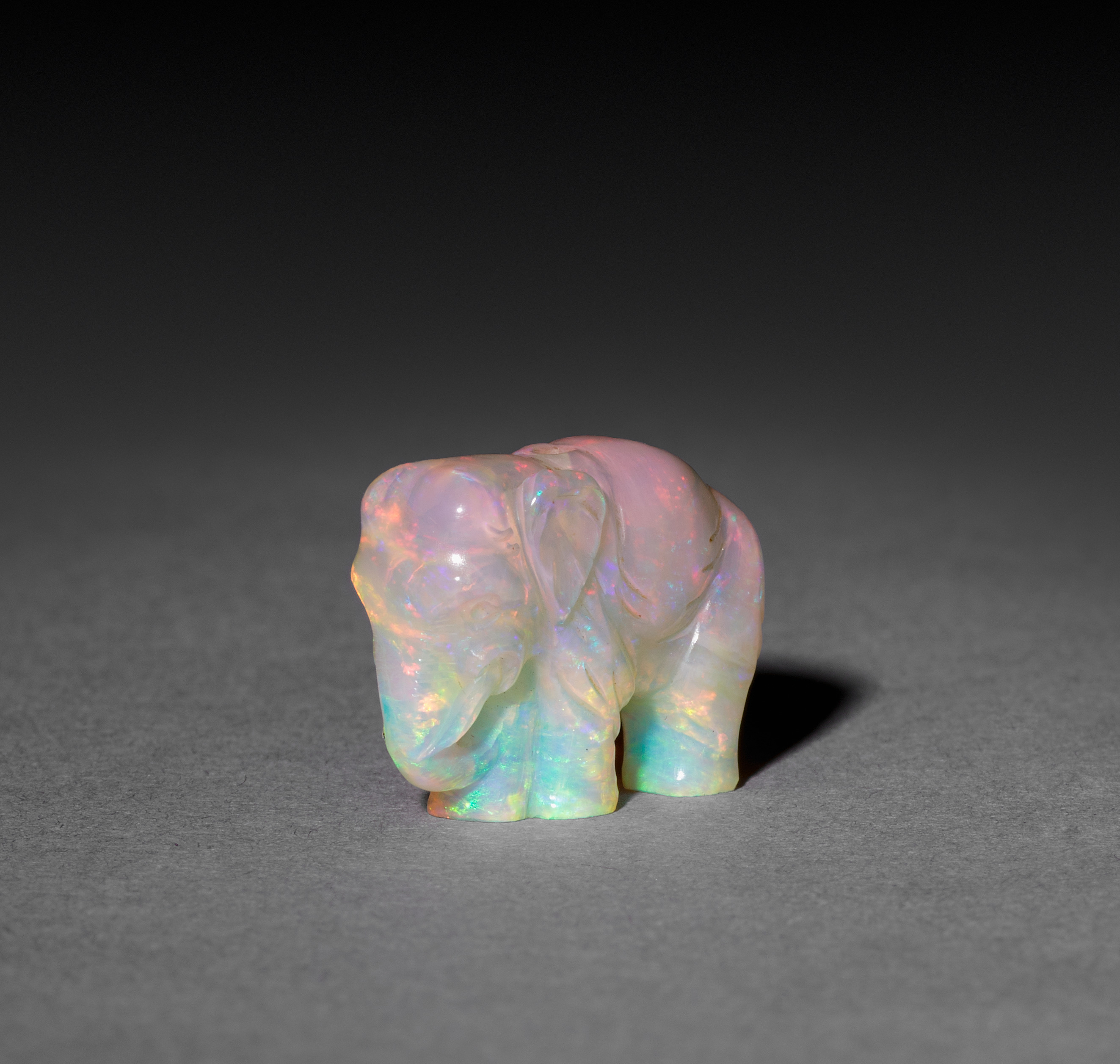 Multicolored elephant figurine made of opal, facing left. The elephant has a large body and a long trunk that curls down. Its ears are small and lay flat against the head. The elephant is carved from a single piece of iridescent opal that shifts between pink, green, and orange. The background is a gray surface with a dark gradient at the top. A shadow is cast to the right of the elephant. The image is titled "Elephant".