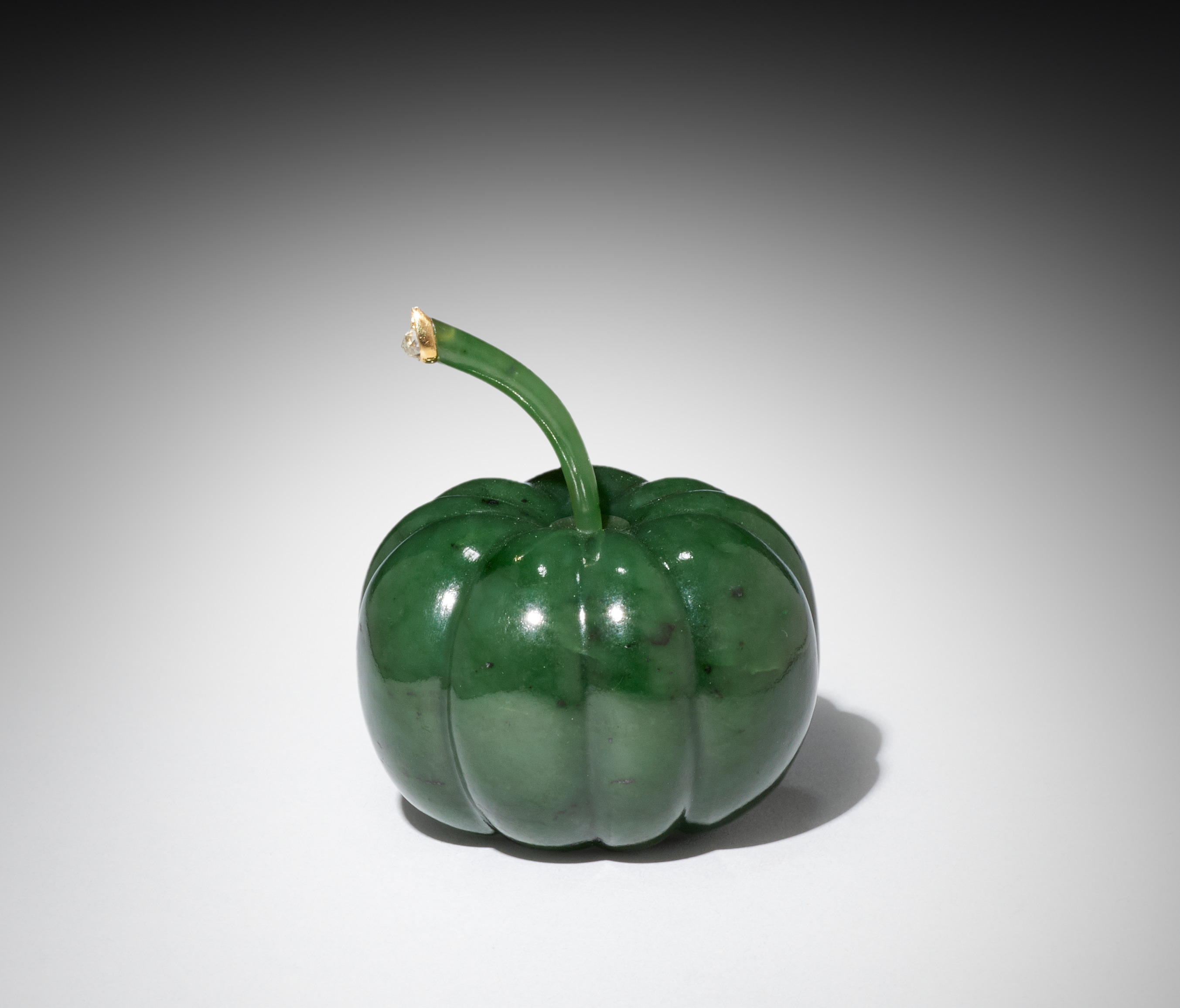 Green pumpkin-shaped object with a stem on top, stem is thin and curved, gold-colored at the tip; object has a smooth, glossy surface, appears to be made of jade or similar stone, has ridges around its body; background is white with a gradient to black at the top.