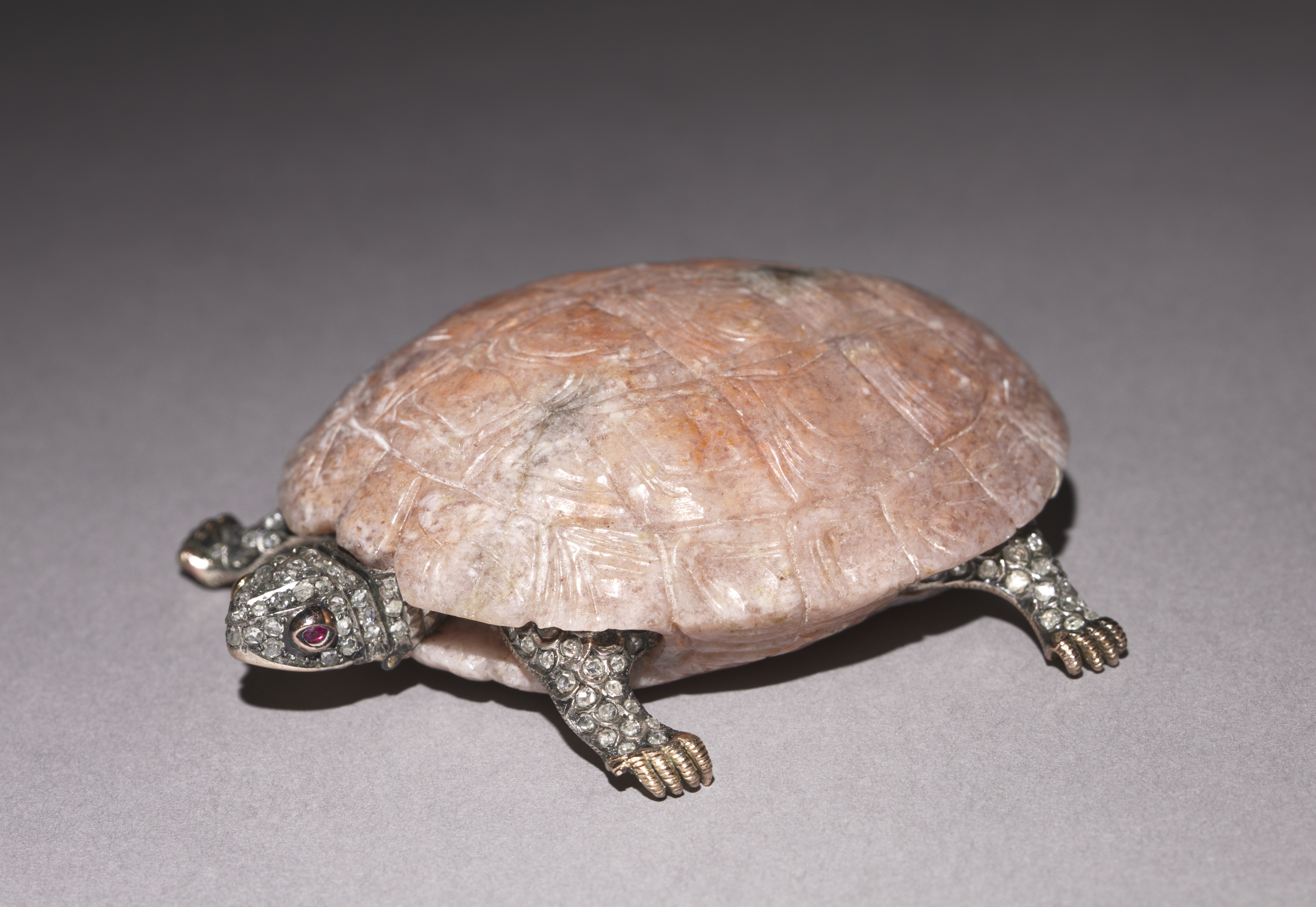 Turtle figurine with a pink stone shell featuring etched lines to resemble a turtle's shell. The head, legs, and tail are made of metal, encrusted with clear gemstones. The eyes are made of a red gemstone. The front feet have gold claws. The background is a gray surface with a darker gray vignette effect. The object is titled "Turtle Bell Push" and is by "House of Fabergé".