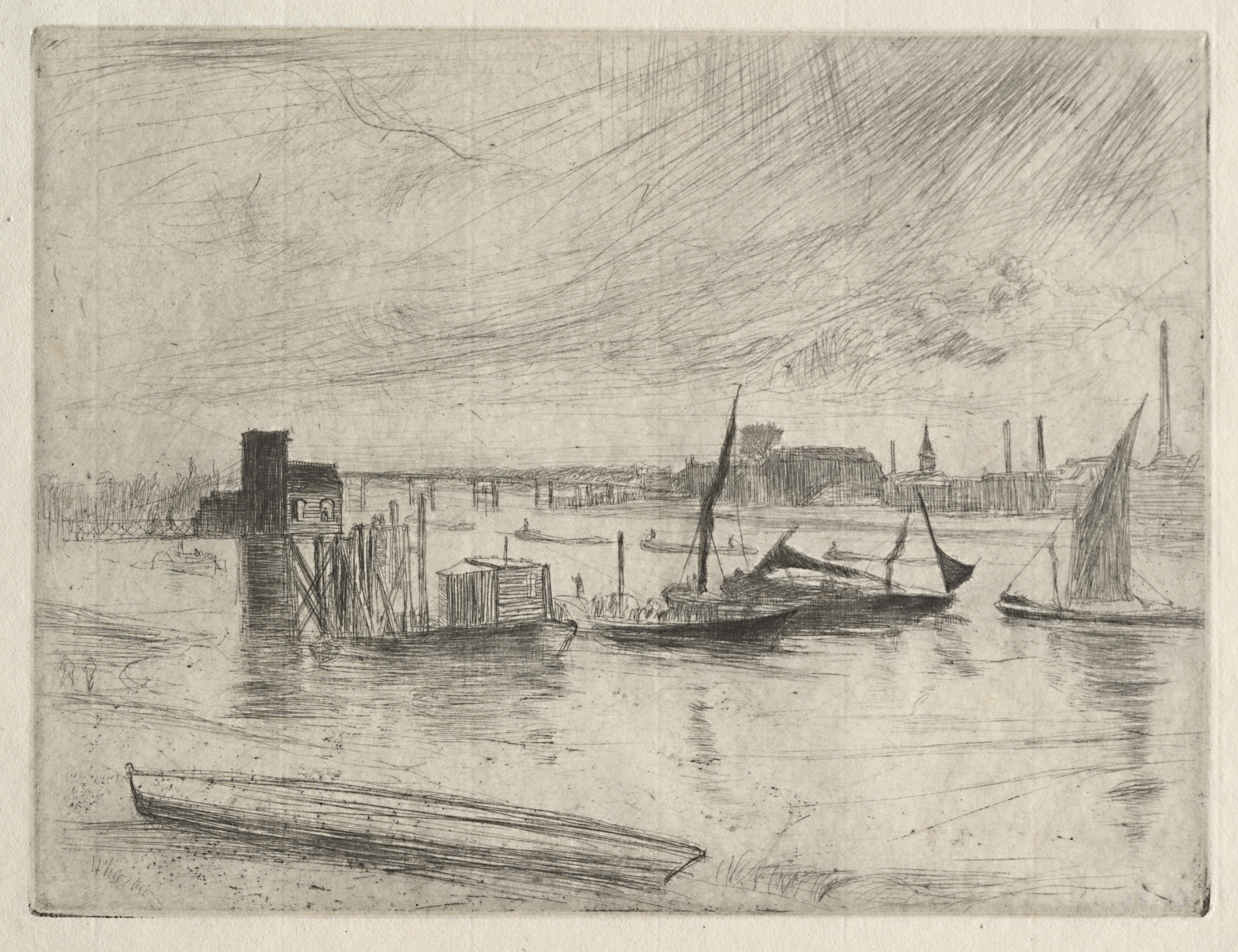 The image depicts a grayscale, etched scene of a harbor. A small boat is in the foreground, while several larger boats are in the middle ground. The boats are on a body of water with visible ripples. On the left side of the image, a dock or pier extends into the water. In the background, there are buildings and a bridge spanning the width of the image. The sky above is filled with diagonal lines, suggesting wind or rain. The overall atmosphere of the image is one of a busy, industrial waterfront scene. The title of the piece is "Early Morning Battersea" by James McNeill Whistler.