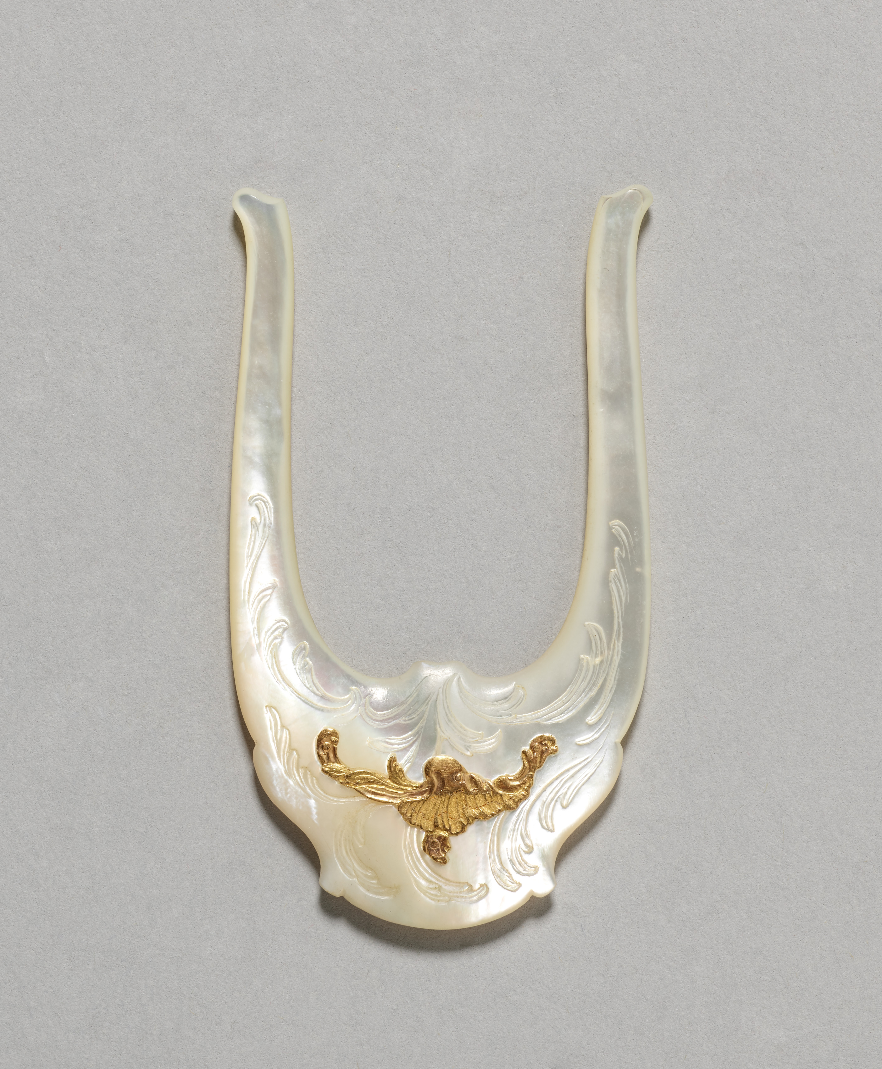 Mother-of-pearl necklace pendant with a gold-colored figure; white background; decorative floral engravings; rounded U-shaped.