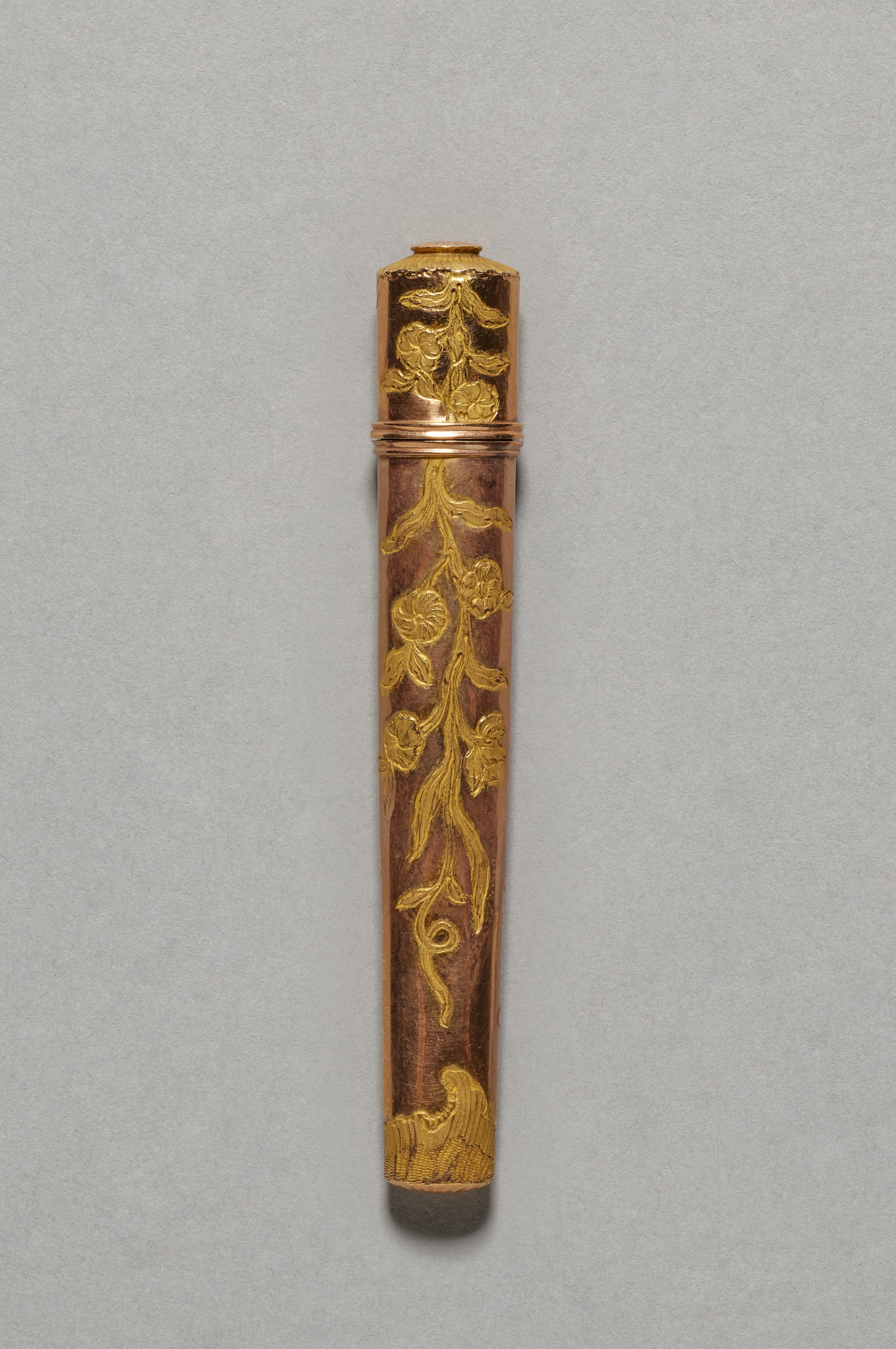 Cylindrical case with a closed end and an open end with a cap on top. The case is made of dark-colored material, possibly wood or lacquer, and features a gold-colored floral design that wraps around the body. The cap on top of the case is also gold-colored and features a floral design. The case appears to be ornate and decorative, with intricate details on the floral pattern. The background of the image is a light gray color.