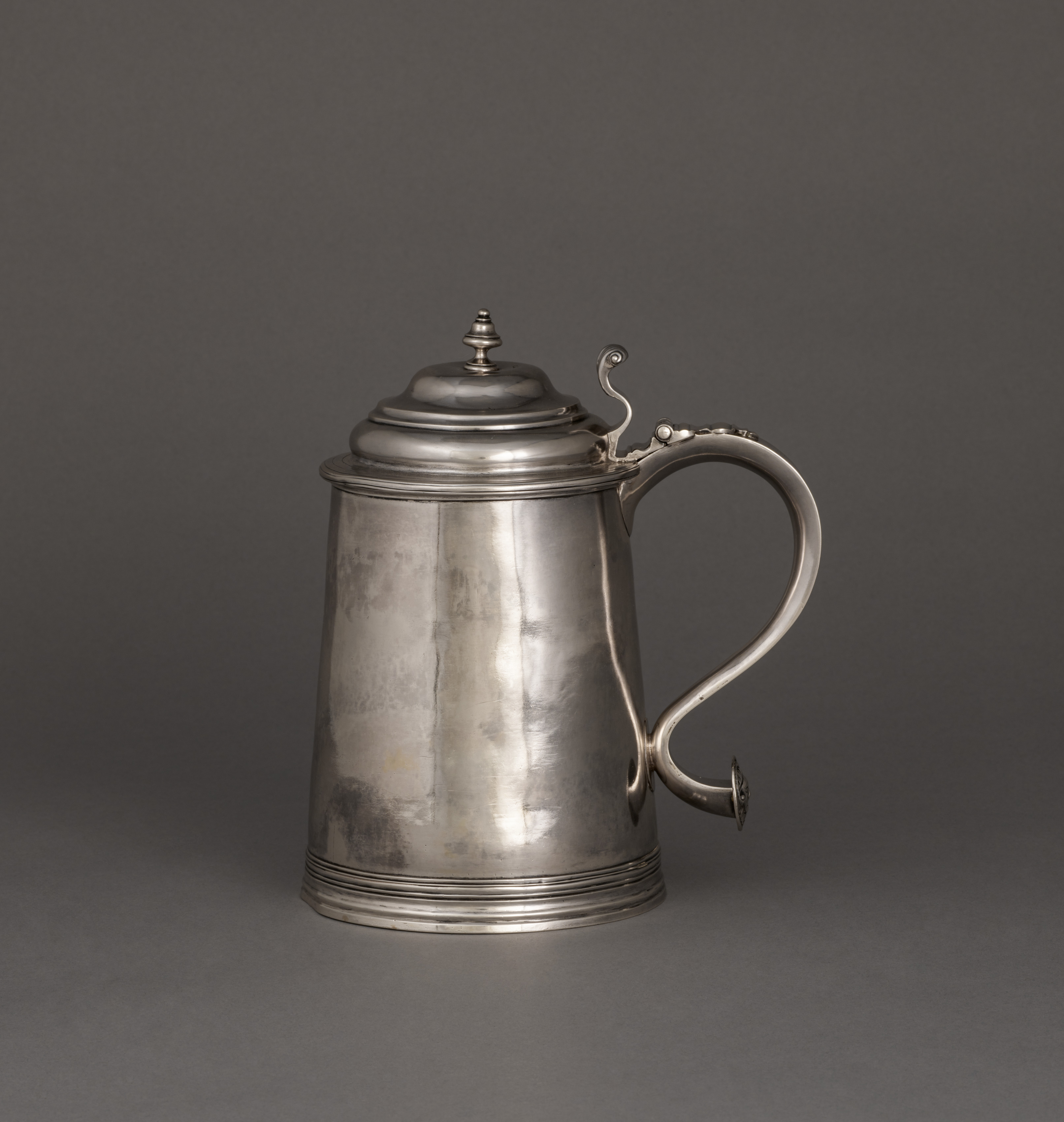Tankard by Samuel Casey. Silver-colored metal tankard with a handle on the right side and a lid on top. The tankard is tall and narrow, tapering slightly towards the top. It has a small finial on top of the lid. The handle is curved and attached to the body of the tankard. The base has a series of grooves around it. The background is a solid dark gray color.