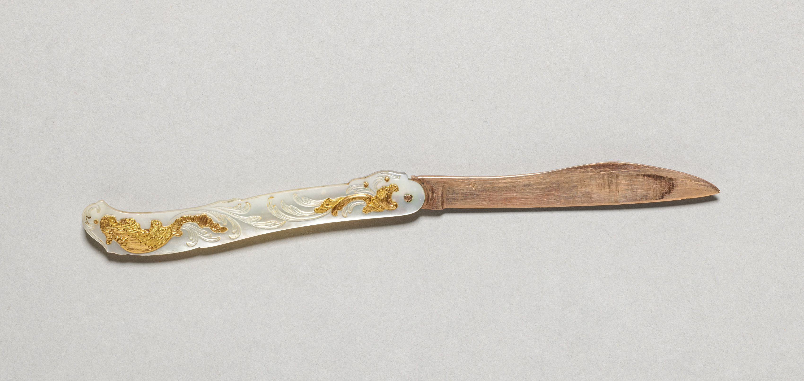 The object is a pen knife. The handle is white with gold-colored designs and a wavy shape. The handle appears to be made of mother of pearl or a similar material. The knife has a wooden section that appears to be the blade and is smooth. The background is light gray. The object titled 'Pen Knife from a Sewing Box (Nécessaire)' is by an unknown artist.