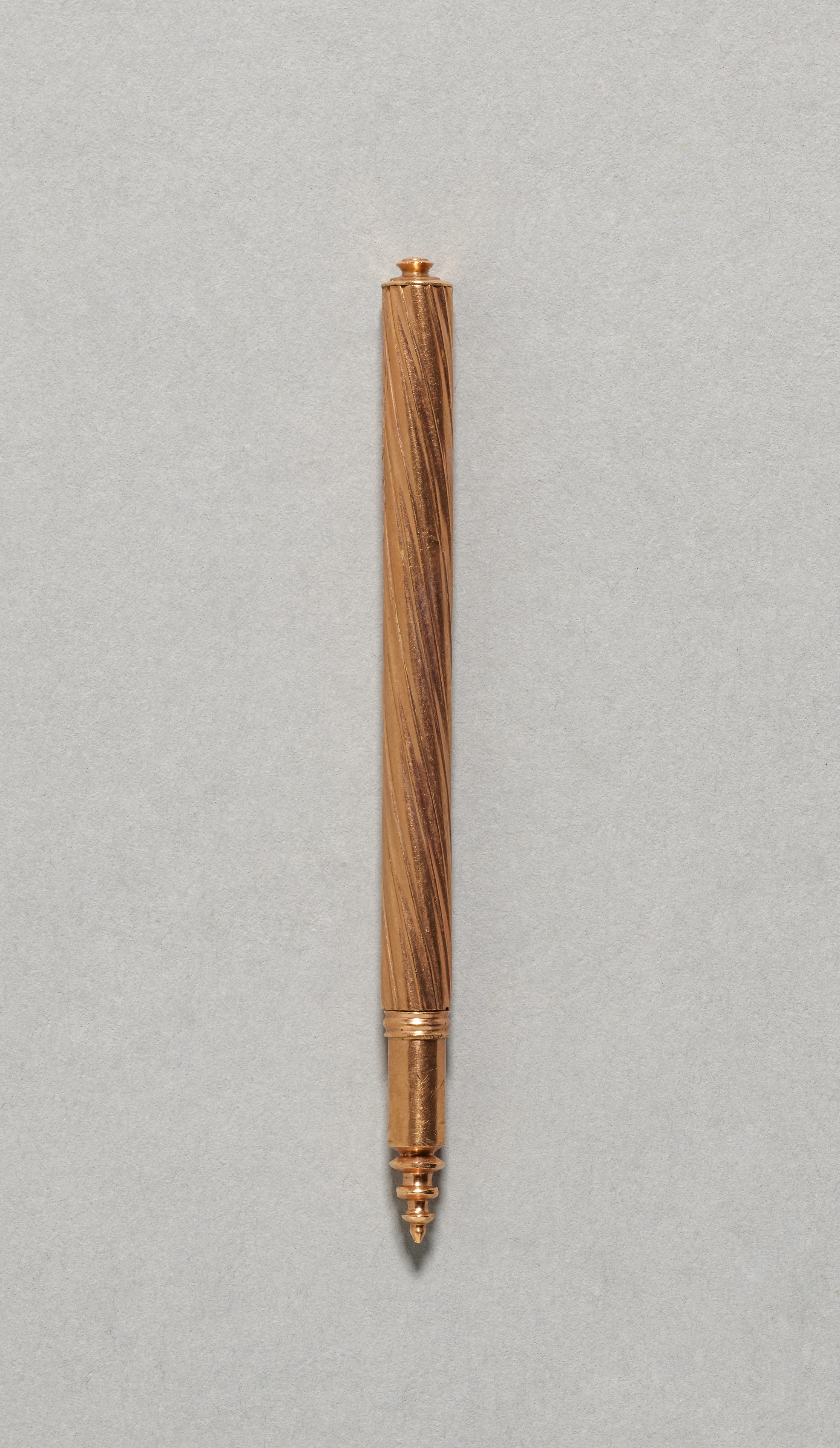 Pencil from a Sewing Box (Nécessaire) by Jean-Henri Riesener. The image shows a gold-colored, cylindrical object with a pointed tip. The object has a rounded top and bottom. The body features a wood grain pattern. A decorative band encircles the middle. The tip is metal and tapered to a point. The object is centered on a light gray background. The background appears flat and featureless.