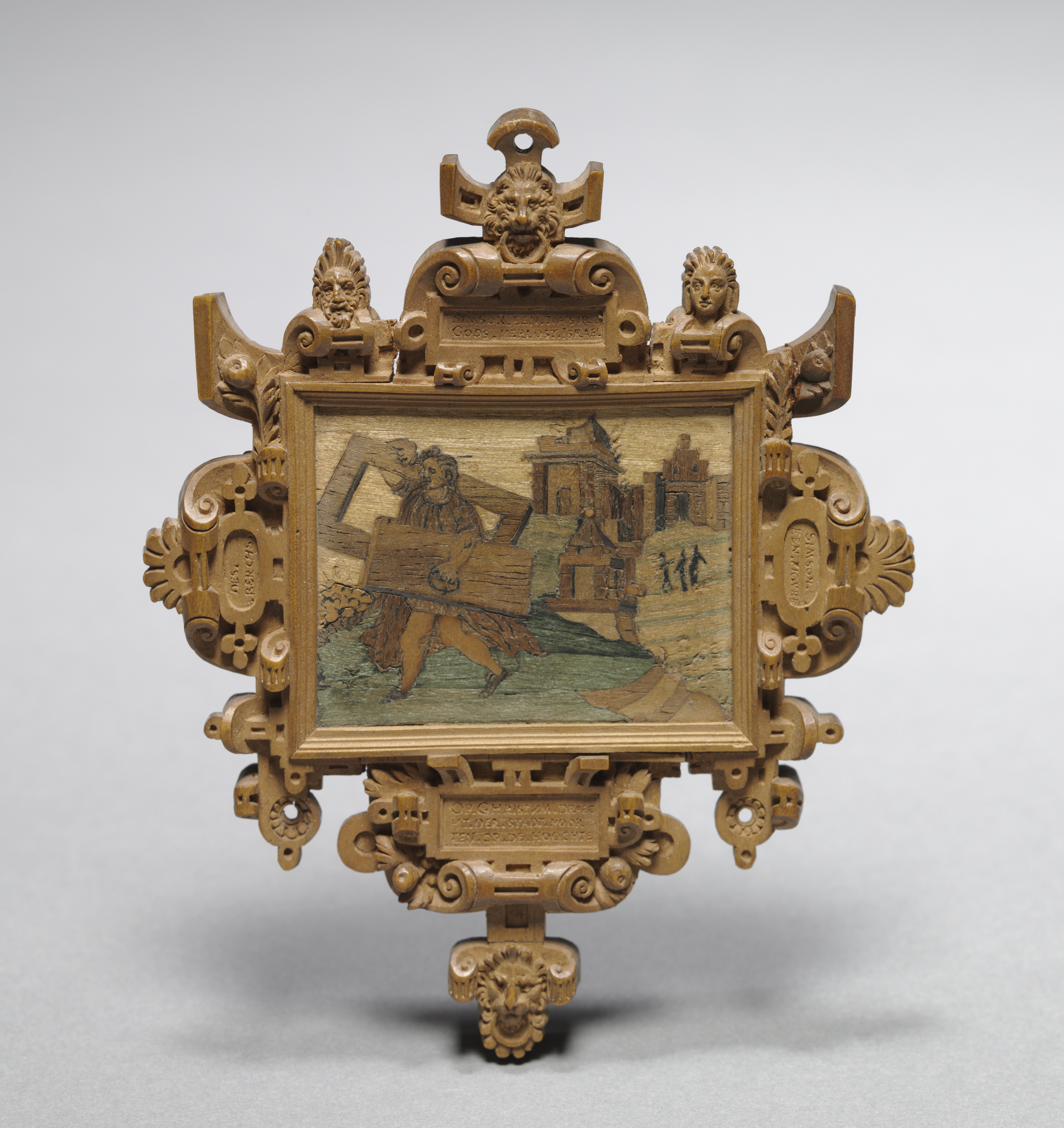 Golden-colored ornate frame with protruding carvings on all sides. Top of frame with carvings of two lion-like creatures on the sides and one on the center top. Frame made of gold-colored metal, possibly brass or bronze. Carvings on frame include scroll-like designs and floral patterns. Center of frame holds a small painting of a man carrying a wooden object. Background of image is gray. Frame appears to be standing on a small stand. Frame has a rectangular shape with protruding carvings on all sides. Small painting within frame depicts a scene with buildings in the background. Carvings on frame include three-dimensional lion-like heads.