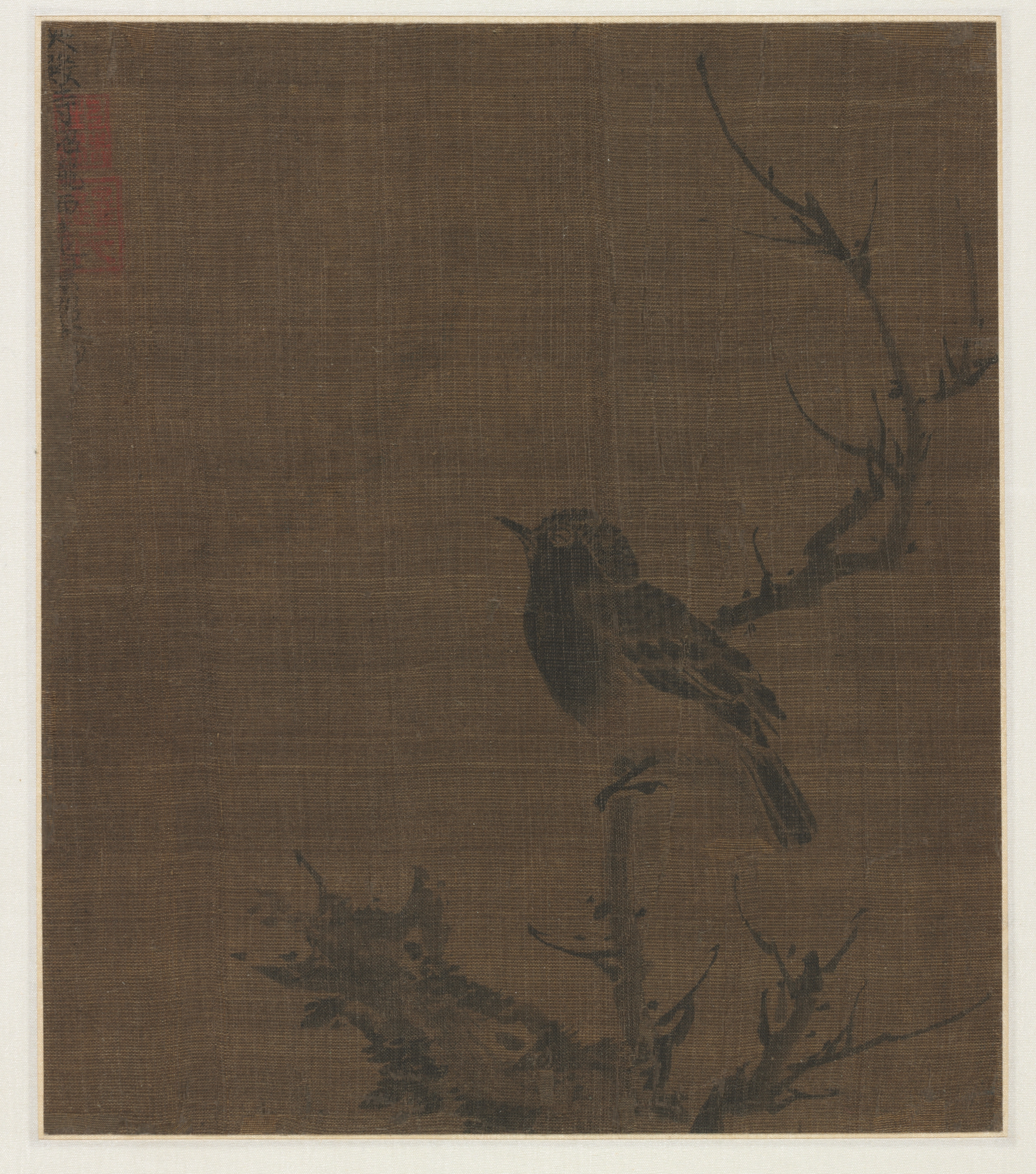 Brown artwork showing a small bird perched on a prunus branch; the artwork has a beige border; brown background; black and red markings; bird facing left; prunus branch extending from bottom right to top right; branch and leaves in bottom left. Sleeping Bird on a Prunus Branch by Bian Wenjin.
