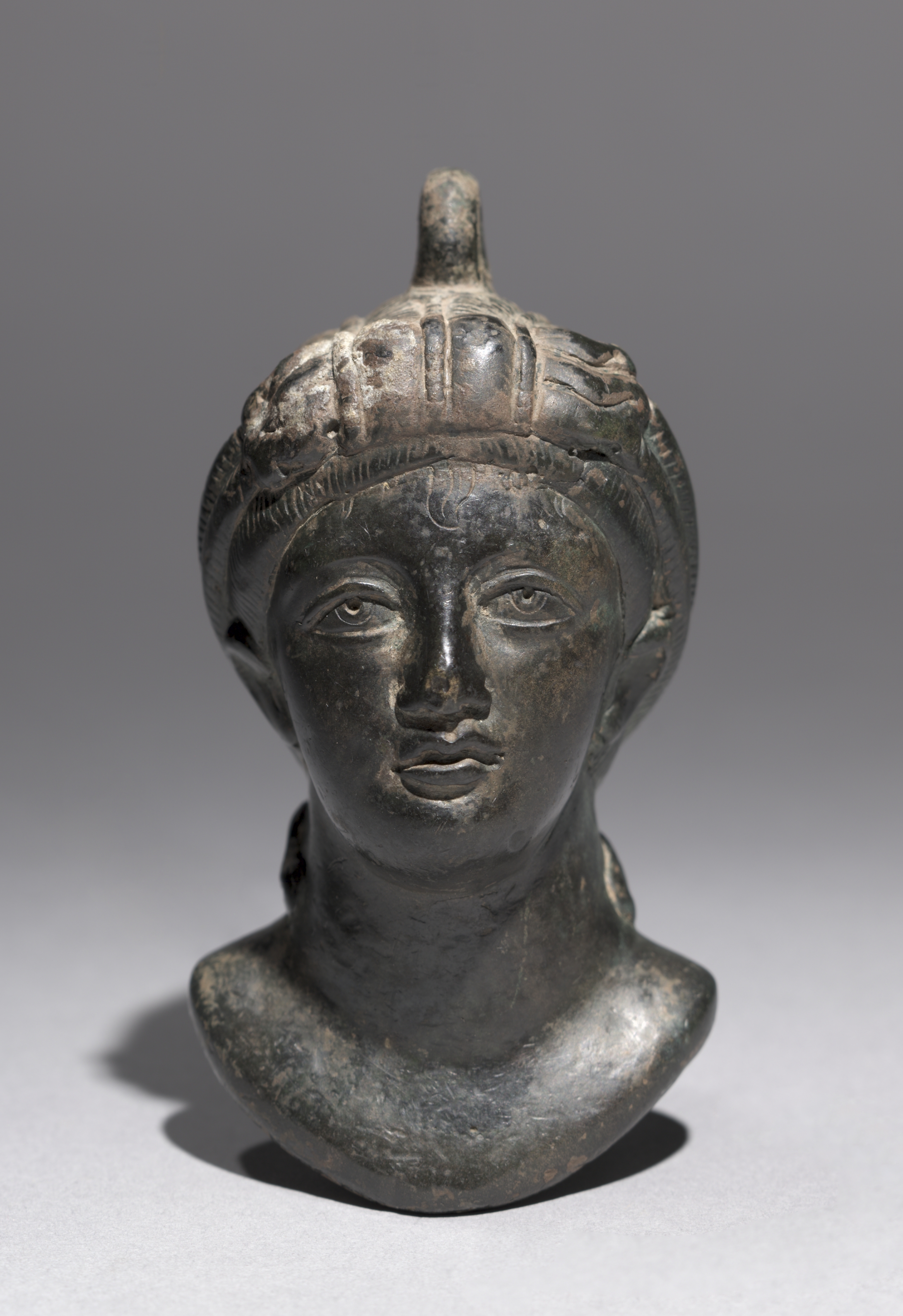 Dark gray metal bust of a woman's head and neck. The woman has a serious expression. Her hair is covered by a headband-like piece with a small knob on top. The headband has lines and folds on it. The bust sits on a gray surface and has a shadow behind and to the left. The background is gray and fades to white at the bottom. The title of the piece is "Balance Weight formed as the Bust of an Empress".