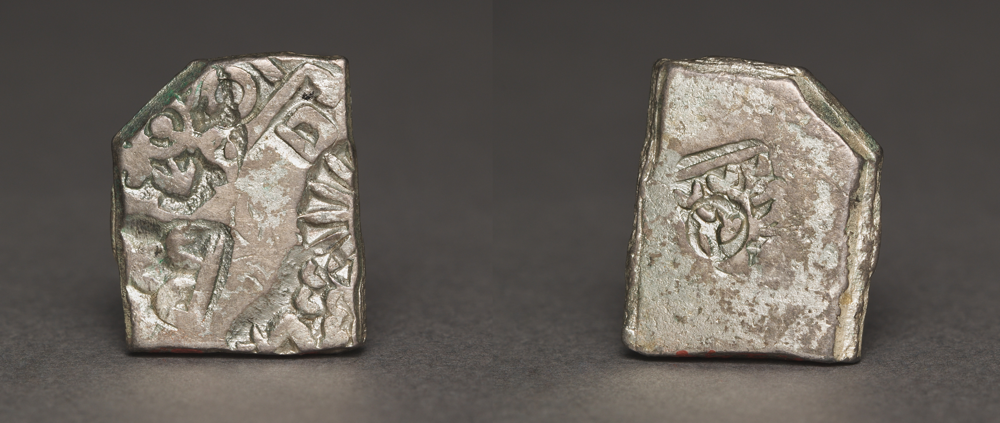 The image shows two sides of a punch-marked coin. The coin is made of silver-colored metal and appears to be rectangular with slightly rounded edges. The left side of the coin features a tree-like symbol with a curved line above it and other indistinguishable markings. The right side of the coin displays a circular symbol surrounded by curved lines. The coin has a weathered appearance with visible signs of wear and tear, including discoloration and rough texture. The background of the image is a dark gray color. The coin's title is "Punch-Marked Coin".