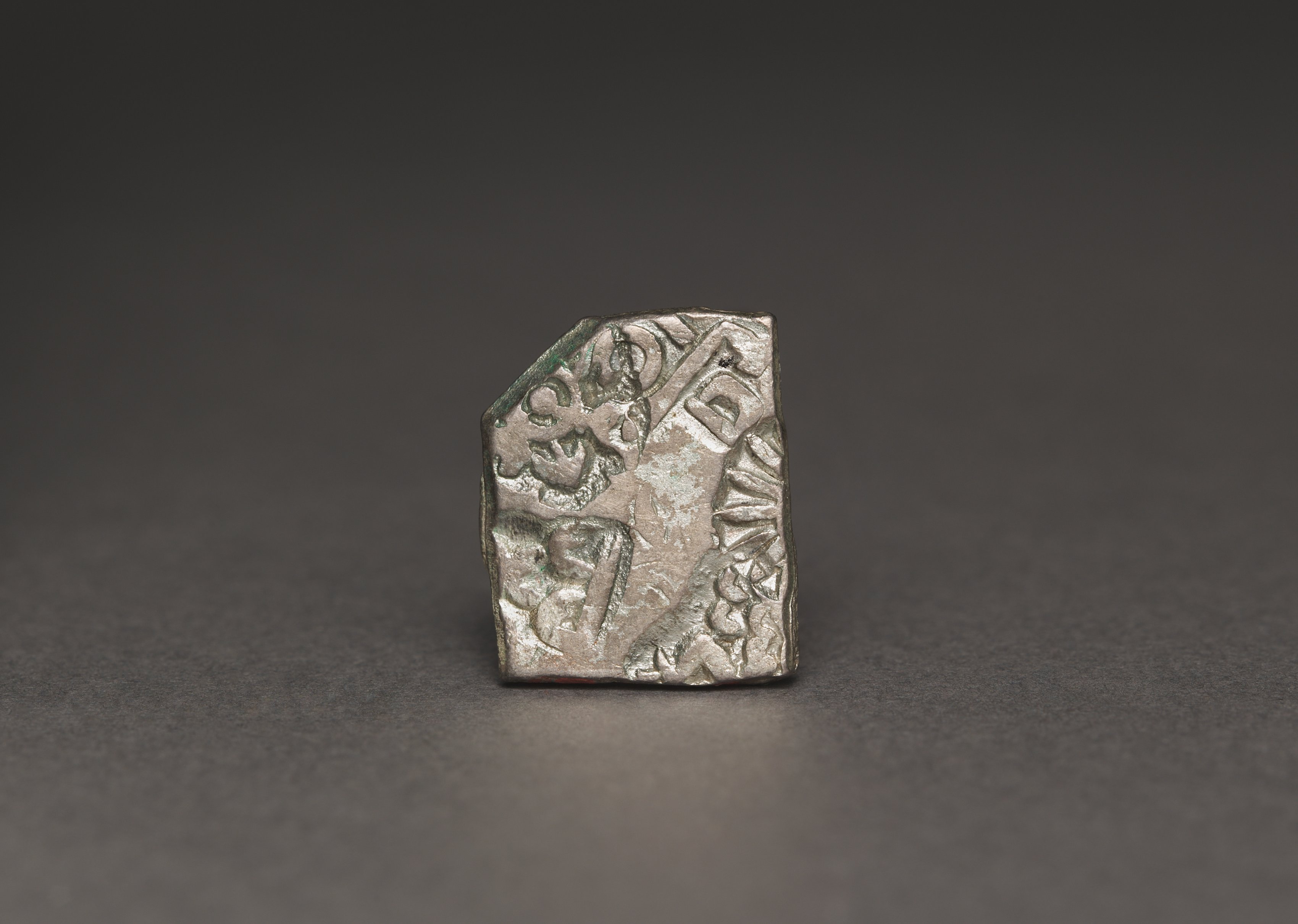 Punch-marked coin by artist unknown, square-shaped with rough edges, made of silver-colored metal, featuring various punched marks and designs across its surface, with a raised cross-like symbol prominently displayed.