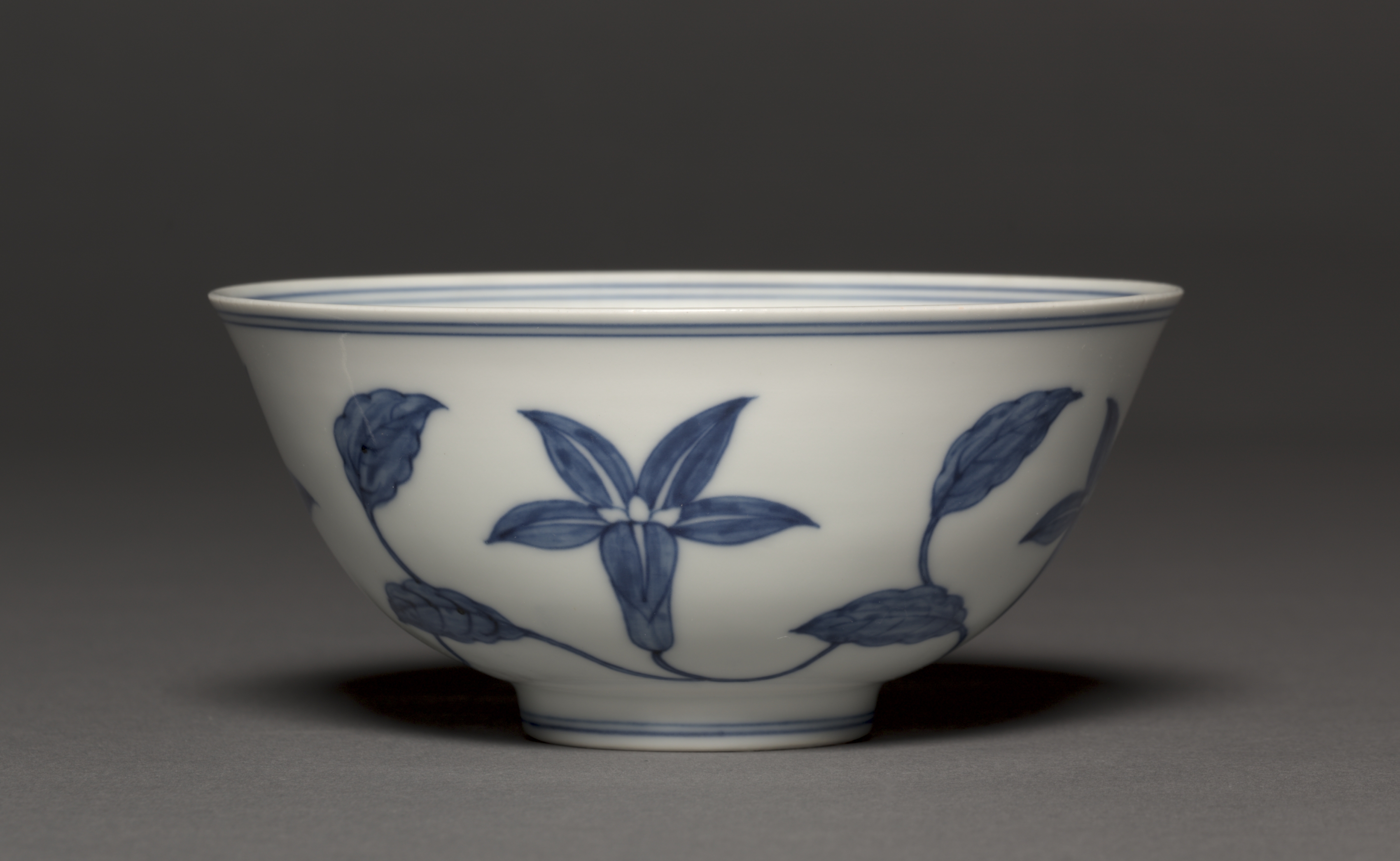 White ceramic bowl with blue floral design. The bowl has a rounded body with a narrow base and a wide mouth. Blue stripes line the rim on the inside and outside. A blue floral pattern featuring lily-like flowers and leaves wraps around the exterior. The background is dark gray. Bowl titled "Bowl with Lily Scrolls".