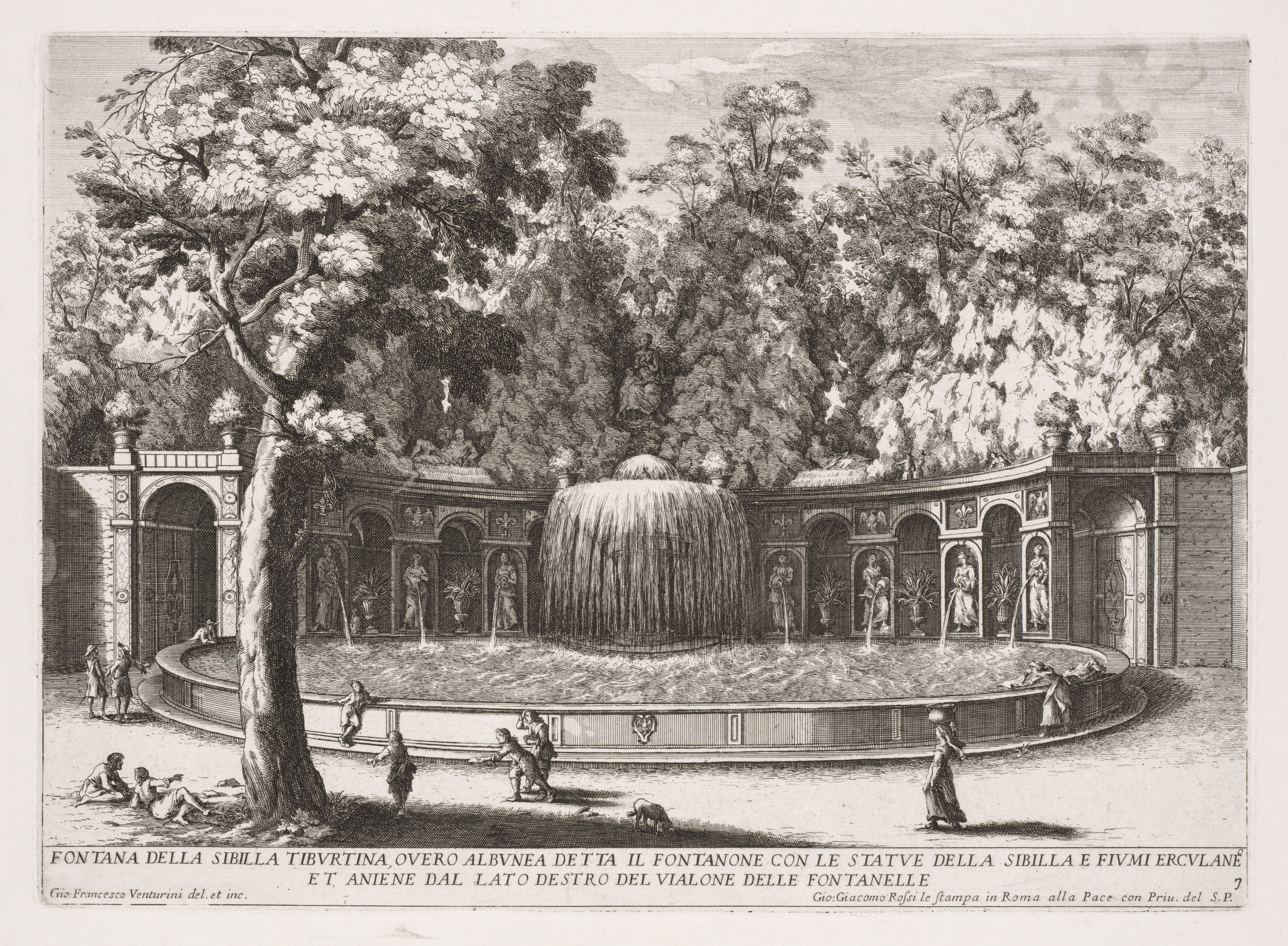 Black-and-white illustration of a fountain. A large tree stands on the left. A large fountain with water jets spraying upwards is surrounded by a low wall with people. A curved wall with arches and statues stands behind the fountain. The wall and fountain are surrounded by trees. Text appears at the bottom.