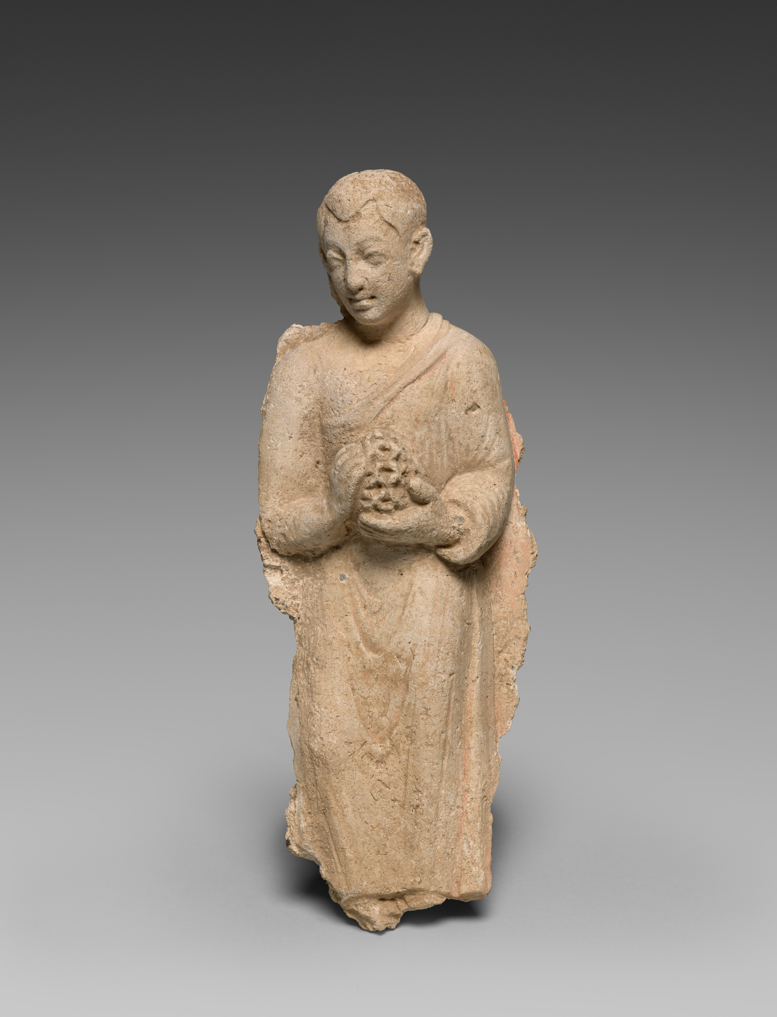 Figure of a monk, dressed in a robe, holding offerings, carved from stone; figure has shaved head; Monk Bearing Offerings.