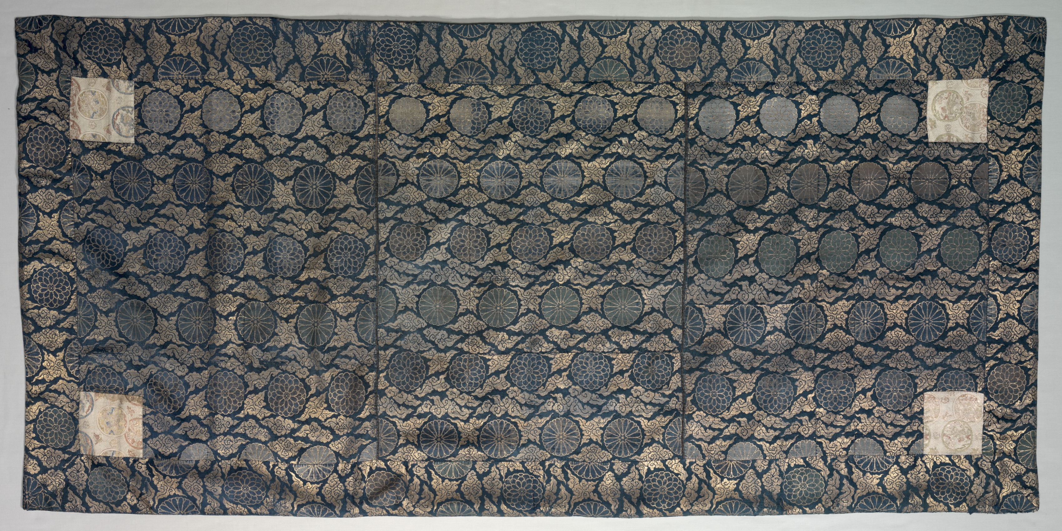 Rectangular piece of fabric with a repeating pattern of various-sized circles and floral motifs in shades of gold, brown, and blue on a dark blue background. The circles have various designs within them. Four beige squares with circular designs are placed at each corner. The fabric appears to be a Buddhist vestment, specifically a Kesa.