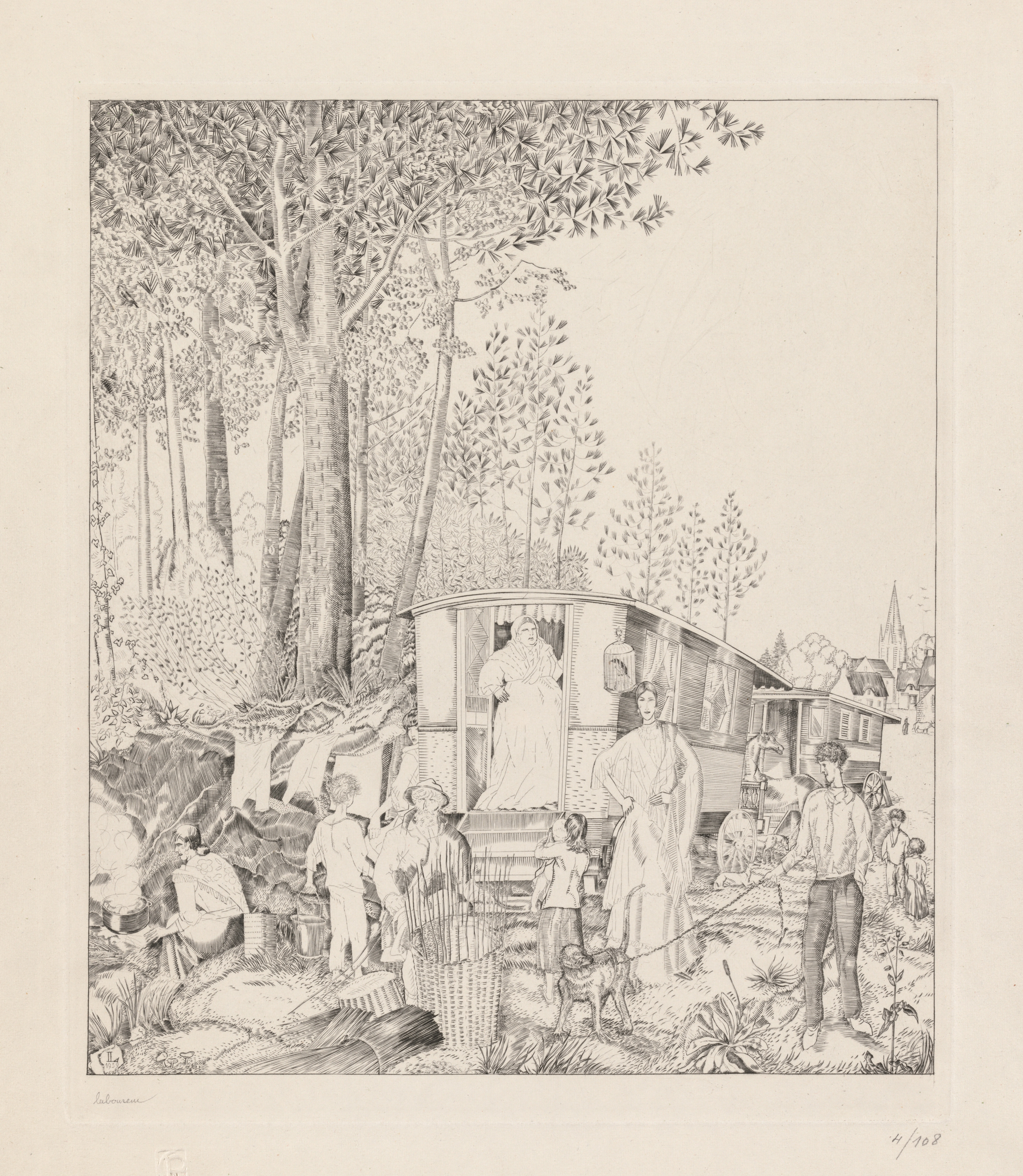 Black and white drawing of a group of people standing and sitting around a stopped train car in a wooded area. The train car is on the left side and has one visible door with a woman standing inside. A woman stands to the right of the train car with one hand on her hip. A dog on a leash is to her right, held by a man. A woman sits on the left side of the image next to a basket, another woman and child are to the left of the train. A man, woman, and two children are on the right side. A town with buildings and a church steeple is in the background on the right. Trees are on the left side. The image is surrounded by a thick off-white border.