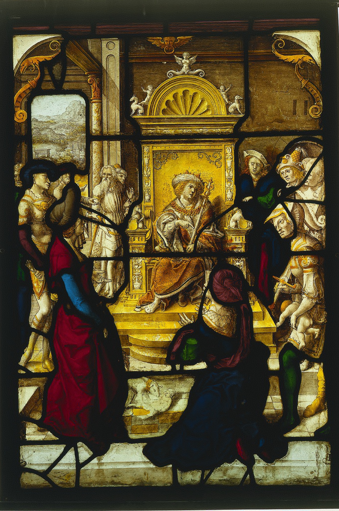 The Judgment of Solomon by Dirk Vellert: A stained-glass window depicting a scene with multiple figures. The central figure sits on a raised gold throne wearing a turban, surrounded by steps. The figure on the left wears a red dress with blue sleeves. The figure on the right wears a blue dress under a dark blue cloak with a red head covering. Two men in armor stand on either side. The background shows brown stone walls with decorative gold accents and a window on the left revealing a landscape. Two cherubs sit on top of a gold decorative element above the central figure.