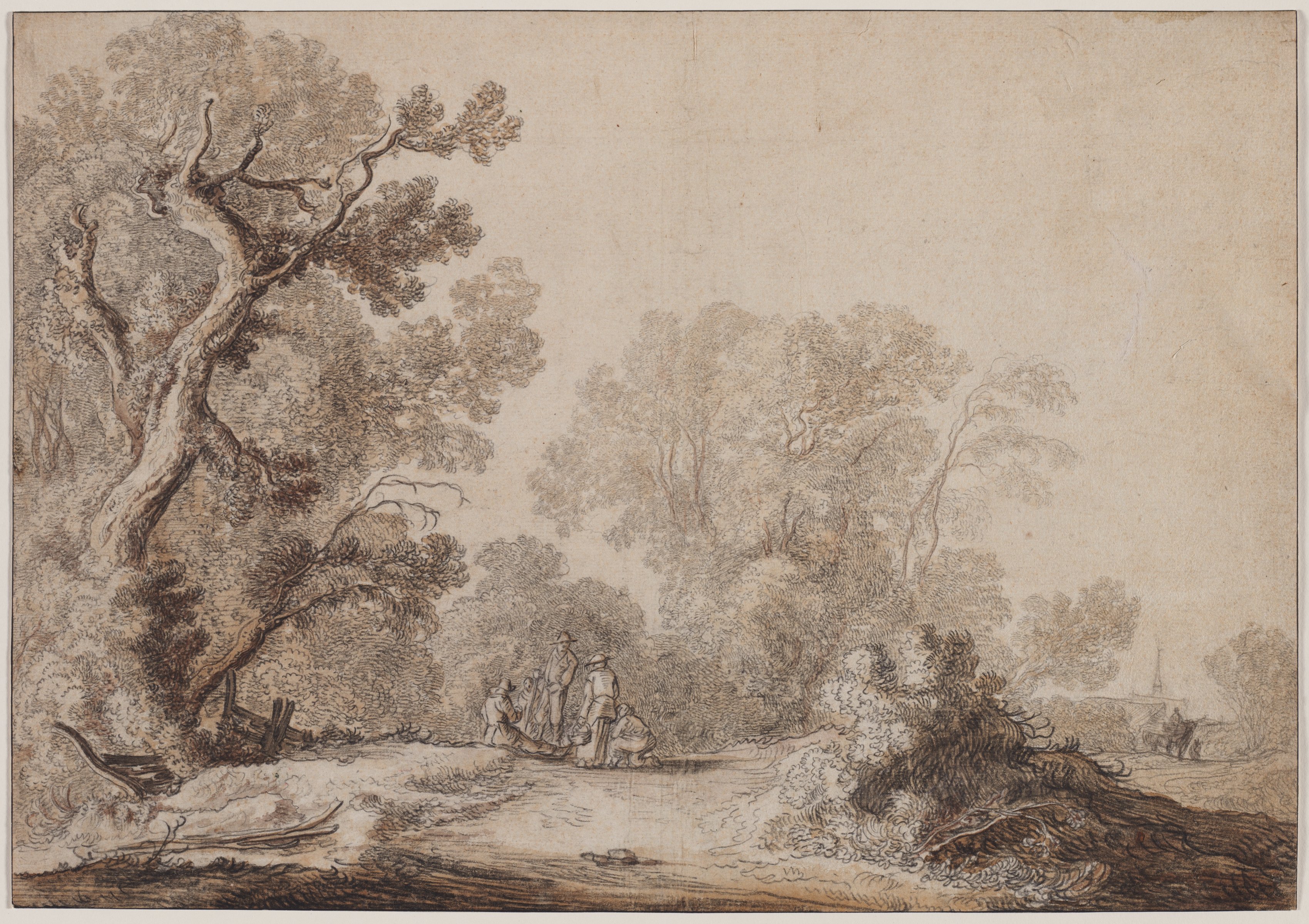 Brown and black drawing on tan paper of a landscape. A large tree on the left side with a large, curved trunk and many branches. A group of people sitting on the edge of a road on the left side, looking down at something. A dirt road leading through a wooded area with trees on both sides. A person on horseback further down the road. A dark area of foliage on the right side. Trees and foliage filling the background. A steeple in the far distance on the right side.