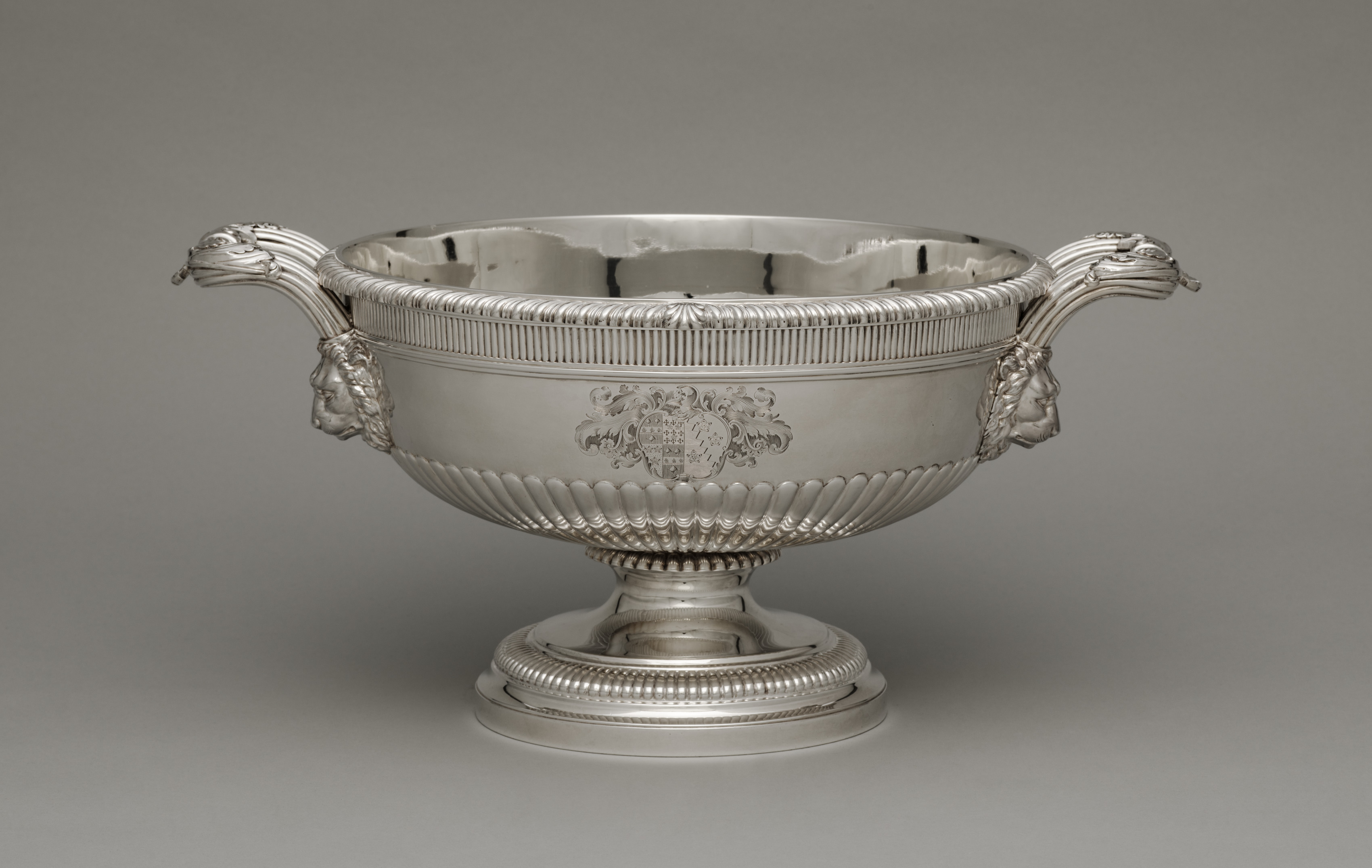 Silver tureen with two handles. The handles are attached to the body with a leaf design and curve outward. The handles are molded with horizontal lines and are topped with a decoration. The bowl features a ribbed rim. Below the rim is an engraved design, and below that are vertical fluted lines encircling the bowl. The body of the bowl is wider than the base; the base features a decorative edge. The base narrows to connect to a short stem. The bowl features an engraved crest or coat of arms. The background of the image is gray.