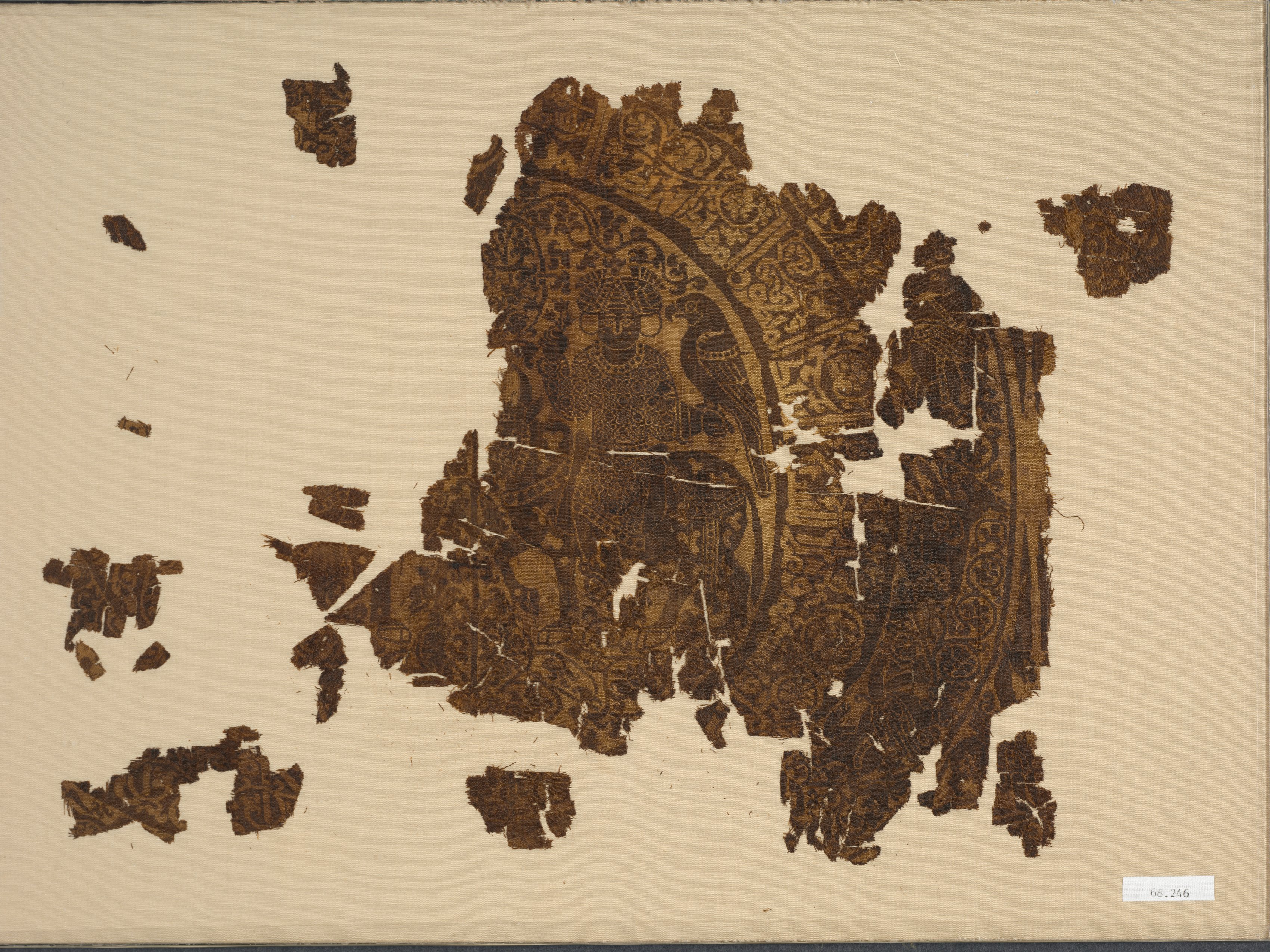 Brown and gold-colored fabric fragment with a rounded rectangular shape, featuring a figure riding a bull to the right; the figure wears a hat and holds a falcon on their right arm; the bull has a long tail; surrounded by a decorative border; the fabric is torn and frayed; mounted on a beige background.