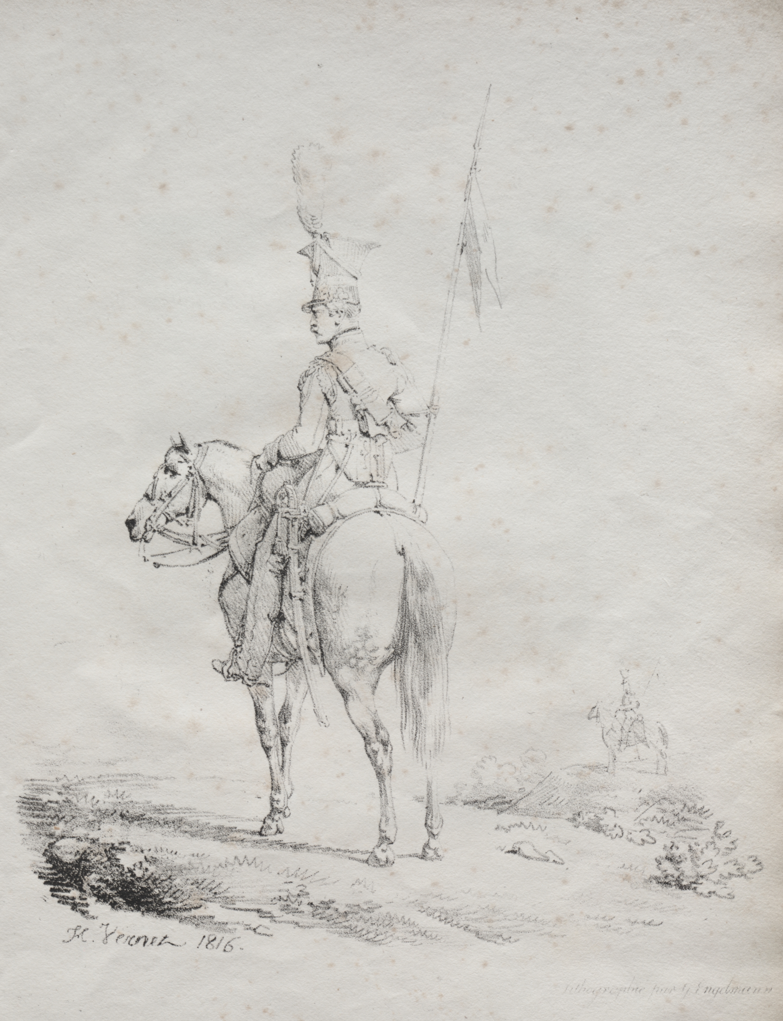 A black and white sketch of a man on a horse. The man wears a tall hat with a feather in it and a uniform. He holds a long spear. The horse faces left. The man and horse are on a dirt path. There are two small signatures at the bottom. The one on the left reads "H. Vernet 1816". The background shows a gray sky and another person on a horse with a spear in the distance.