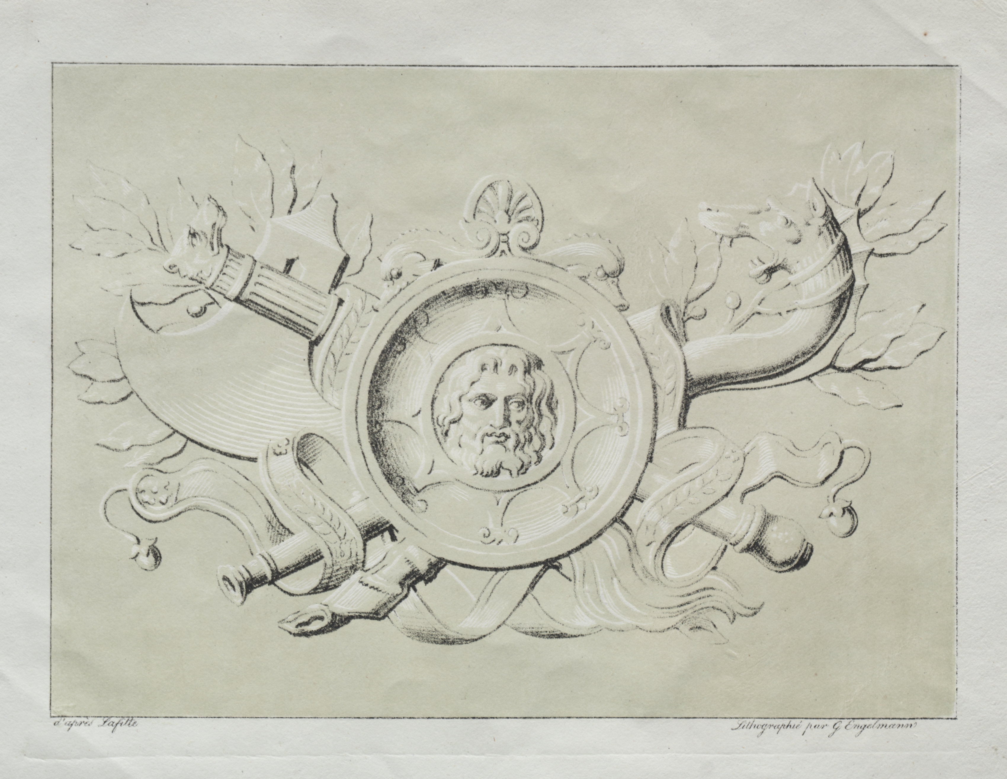 Rectangle lithograph on beige paper. A bearded man's head in a circle surrounded by an ornate frame. The frame has ribbon-like adornments at the bottom and acanthus-like leaves on top. A trumpet-like object protrudes from the left and a floral acanthus leaf design protrudes from the right.