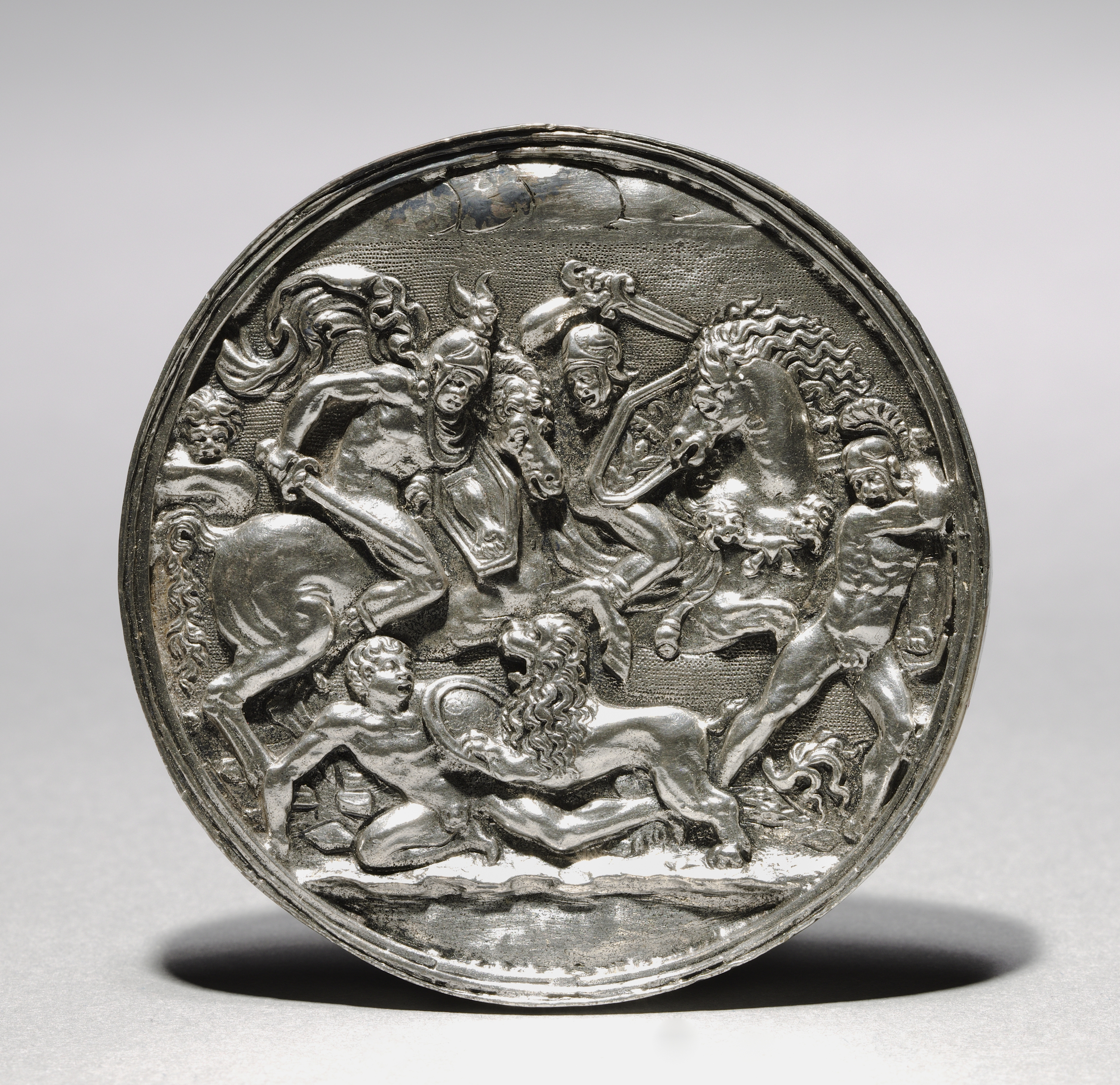 The image depicts a round, silver-colored metal medallion with a raised design. The medallion shows a scene with several figures and an animal. The scene appears to be "Lion Hunt". The medallion has a raised border around its edge. The scene on the medallion shows a lion on the bottom center, with four men around it. The man on the left is on one knee and holds a spear. The man on the right rides a horse. Two other men are on the top, one on horseback with a spear. The background of the image is gray with the medallion casting a shadow. The style of the art is attributed to Moderno.