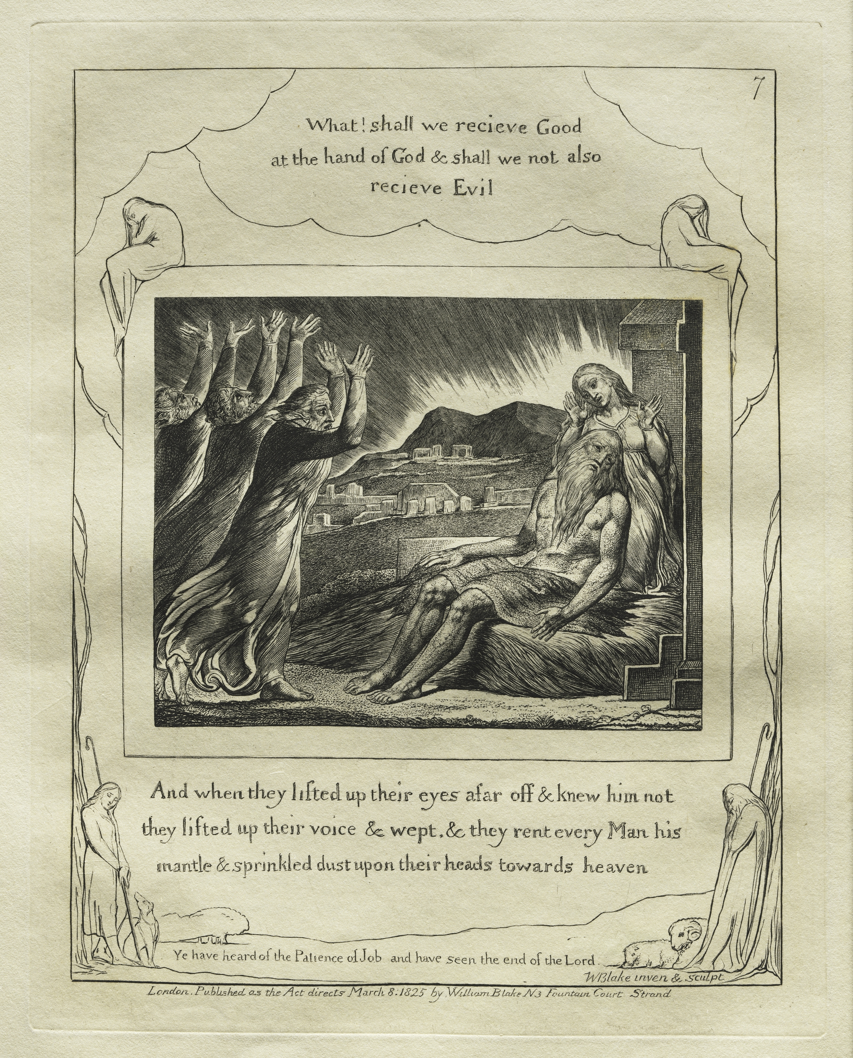 Sepia-toned illustration on aged paper, rectangular with irregular edge. Text at top reads, "What! Shall we receive Good at the hand of God & shall we not also receive Evil." Central image shows a man sitting on ground with long hair and beard, dark robes around lower body. He sits on right side of image, next to a building's corner. On left side, three people face him with arms raised. Background features a town with buildings and mountains. Border has two figures, one on each side, near top. Two lines of text below image: "And when they lifted up their eyes afar off & knew him not they lifted up their voices & wept. & they rent every Man his mantle & sprinkled dust upon their heads towards heaven." Three lines of smaller text at bottom, including a city and date. Signed "W. Blake" at bottom right.