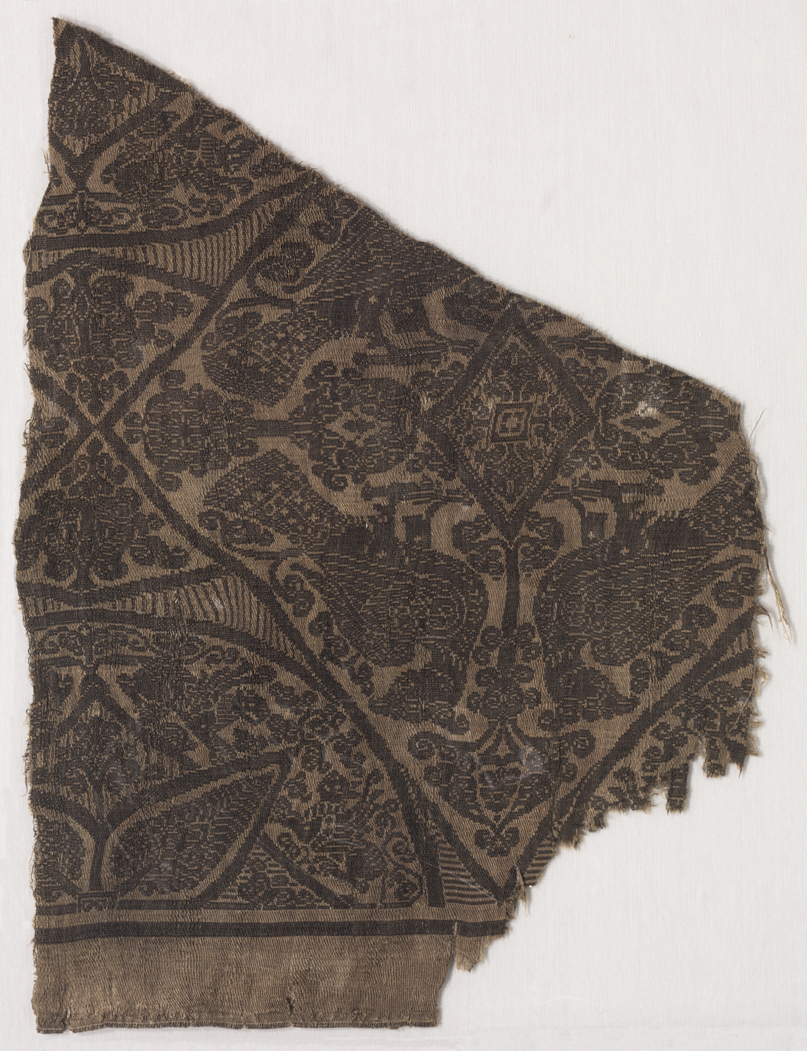 Brown fabric fragment with darker brown pattern, triangular shape with frayed edges, featuring intricate designs including curved lines, shapes, and floral motifs. A border at the bottom with two darker brown stripes. "Fragment" by unknown artist.