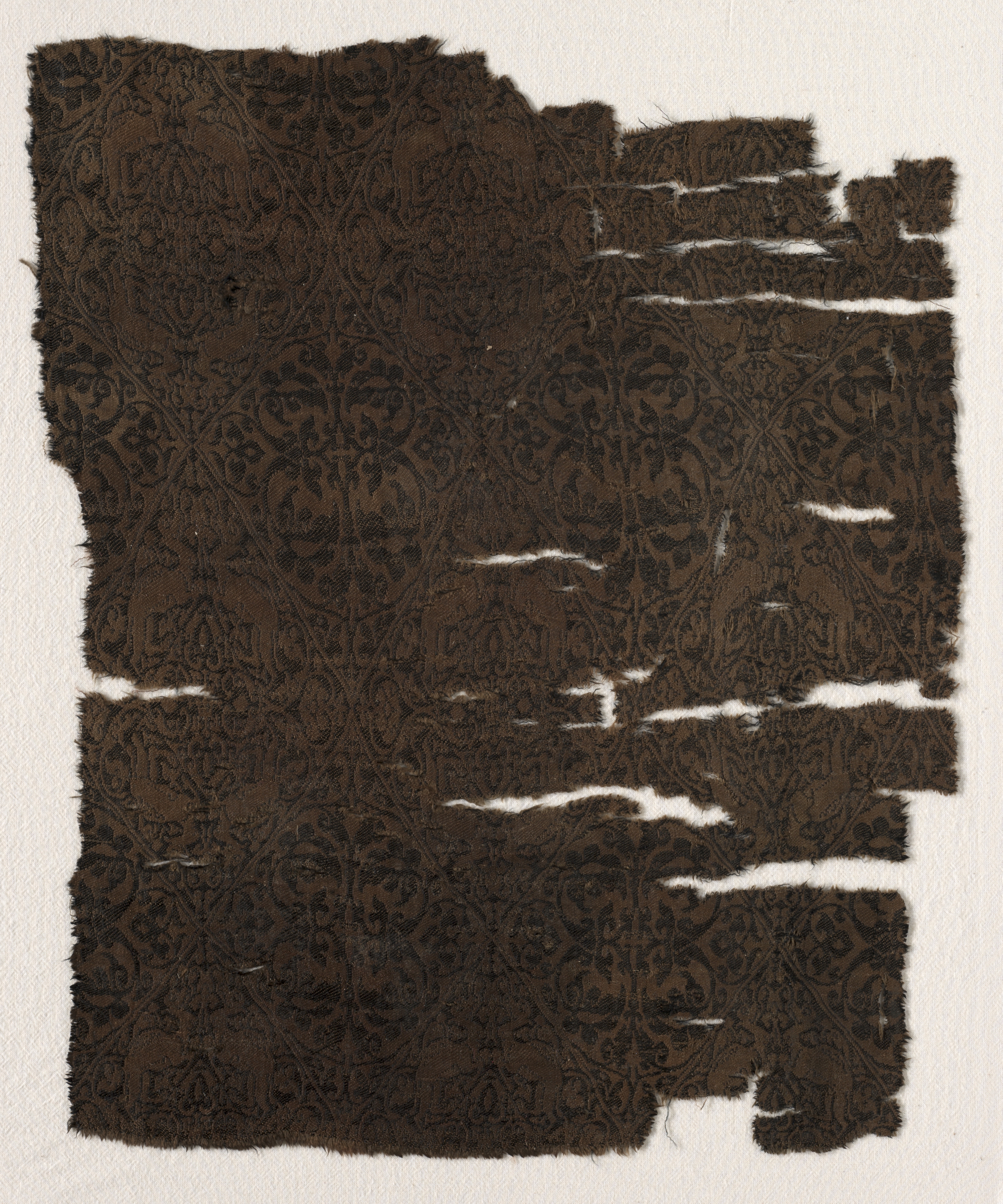 Dark brown fabric with black damask pattern, rectangular with frayed edges, several horizontal tears revealing off-white background, against a beige background; Fragment by artist not specified.