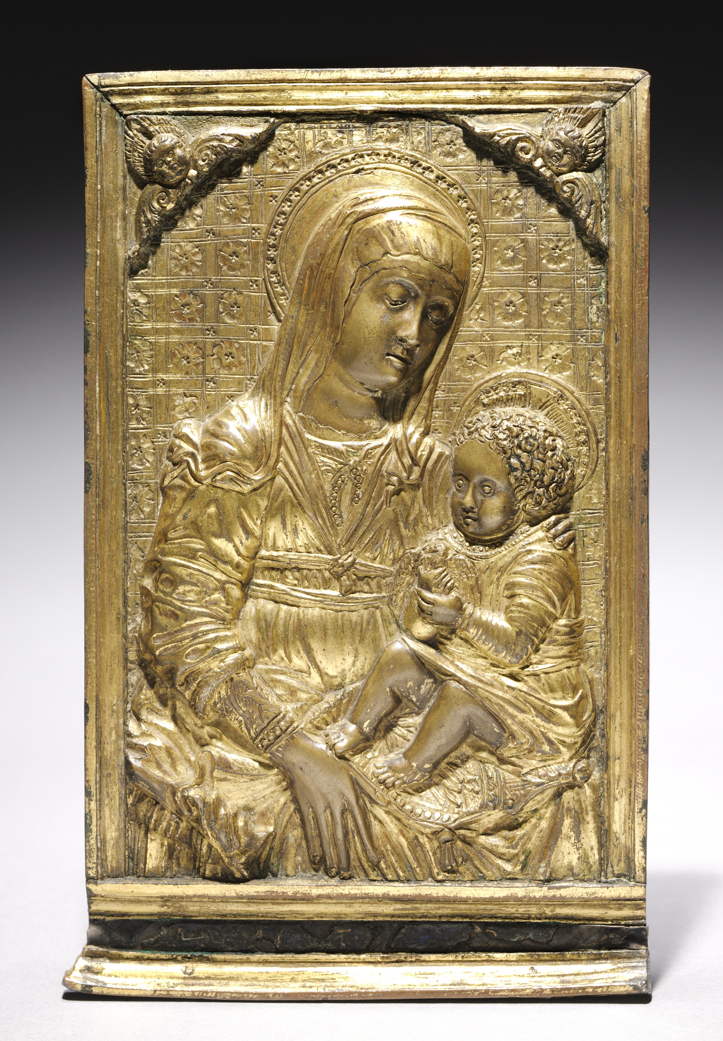 Gold-colored relief sculpture on a rectangular base. The sculpture depicts a woman wearing a head covering, a long-sleeved dress with a belt, and a head halo. She sits and holds a smaller figure, a child with curly hair, a short dress, and a head halo. The child sits on the woman's lap, to her right. The woman's left hand rests on the child's back; her right hand supports the child's right hand. The child holds an object in their left hand. The background of the sculpture features a patterned design with squares and flowers. Two carved winged figures are at the top corners of the relief. The relief has a thick gold-colored frame.