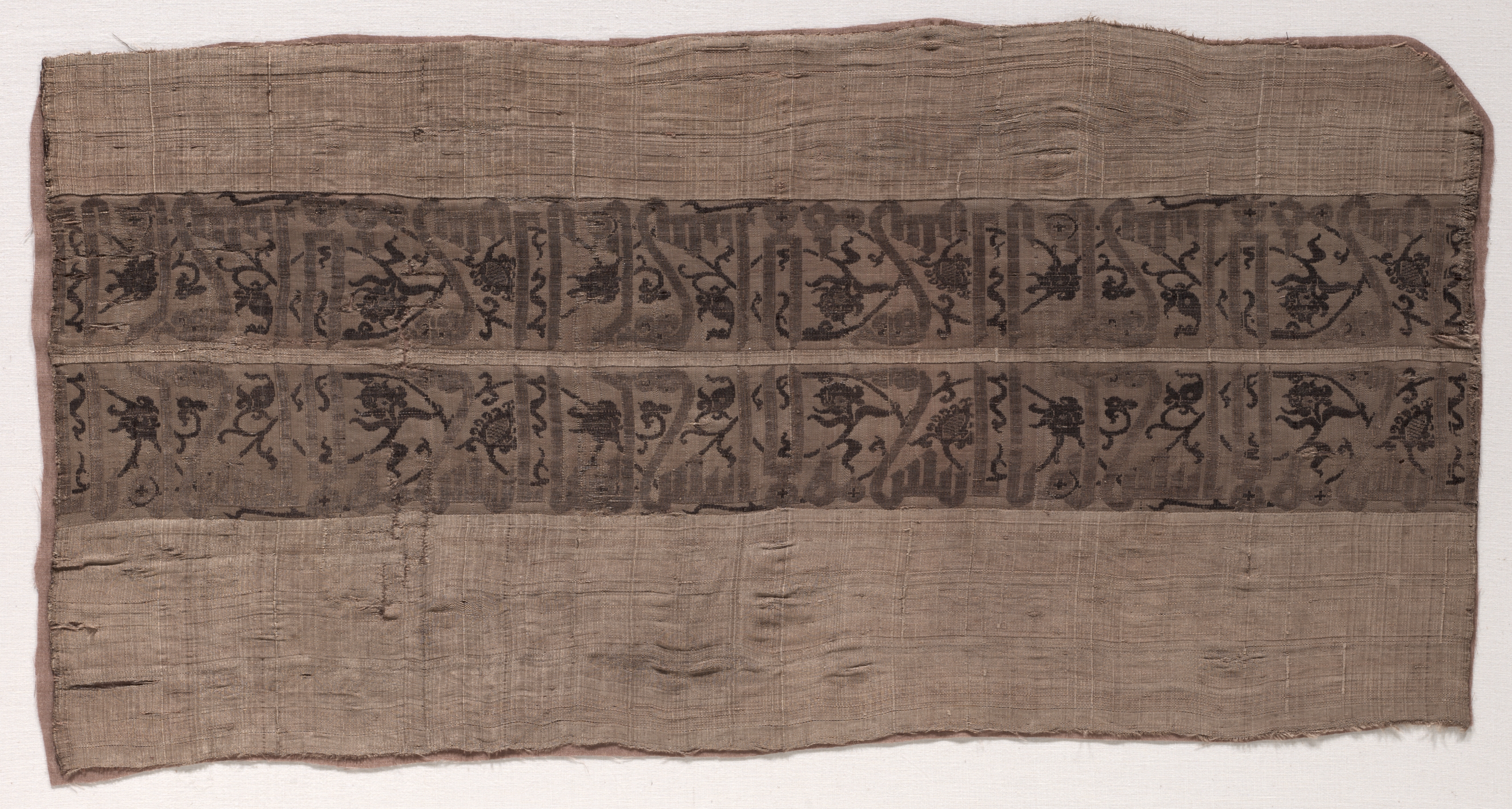 Brown linen fragment with three horizontal bands: a wide band across the top and bottom, and a narrower band in the middle; the middle band features repeating pattern of black curvilinear designs with rosettes; loose threads and frayed edges; mounted on beige backing. Fragment with Inscription.