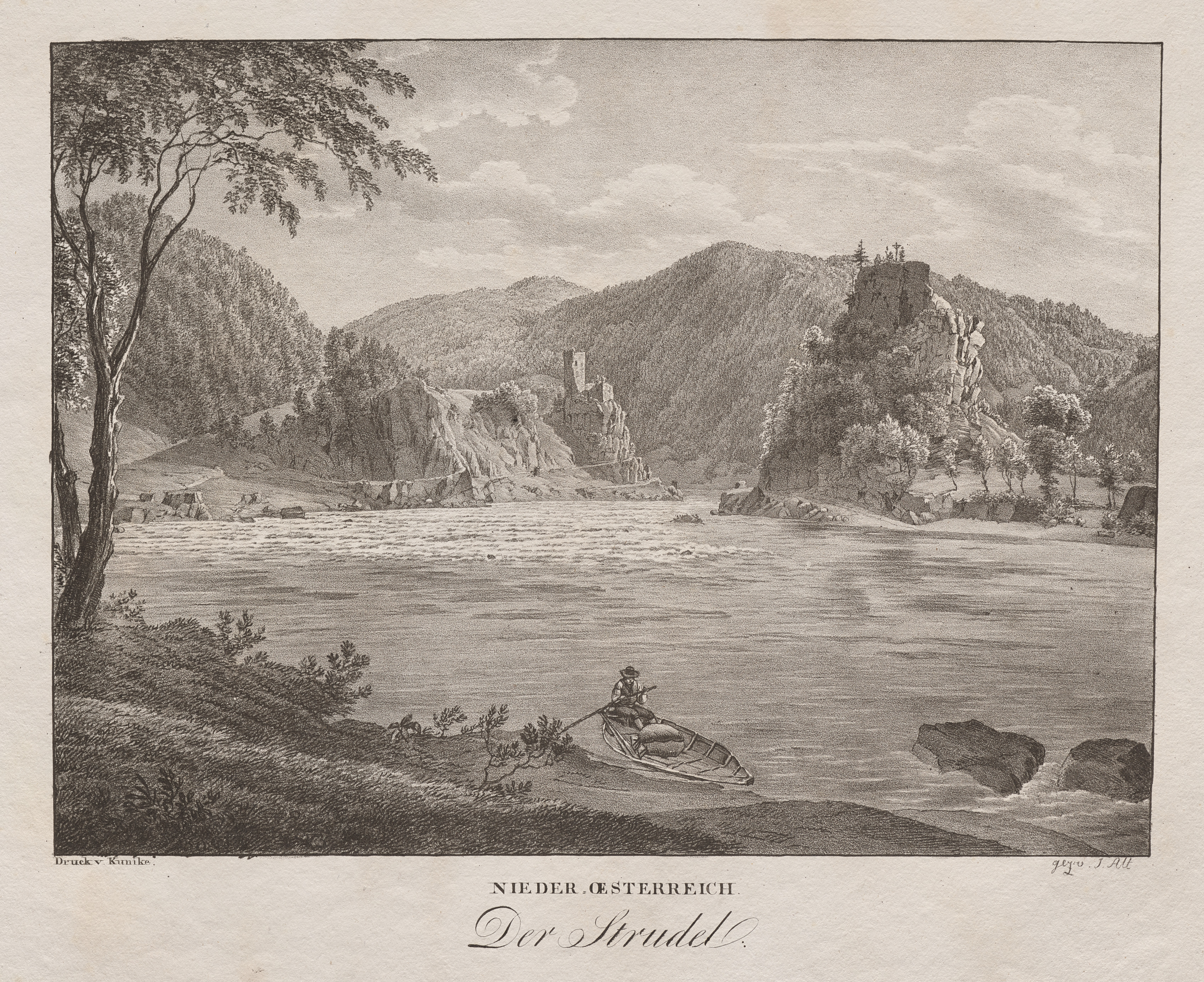Monochrome landscape drawing of a river with a mountainous background. A man rows a small boat along the riverbank. The river is wide and has a few rocks protruding from the water on the right side. There are trees and bushes on the riverbank. A tree stands on the left side. In the background, there are mountains covered in trees, with a ruined castle on the right side. A castle ruin is also visible on the left. The sky is cloudy. Text at the bottom reads "Nieder-oesterreich" and "Der Strudel".