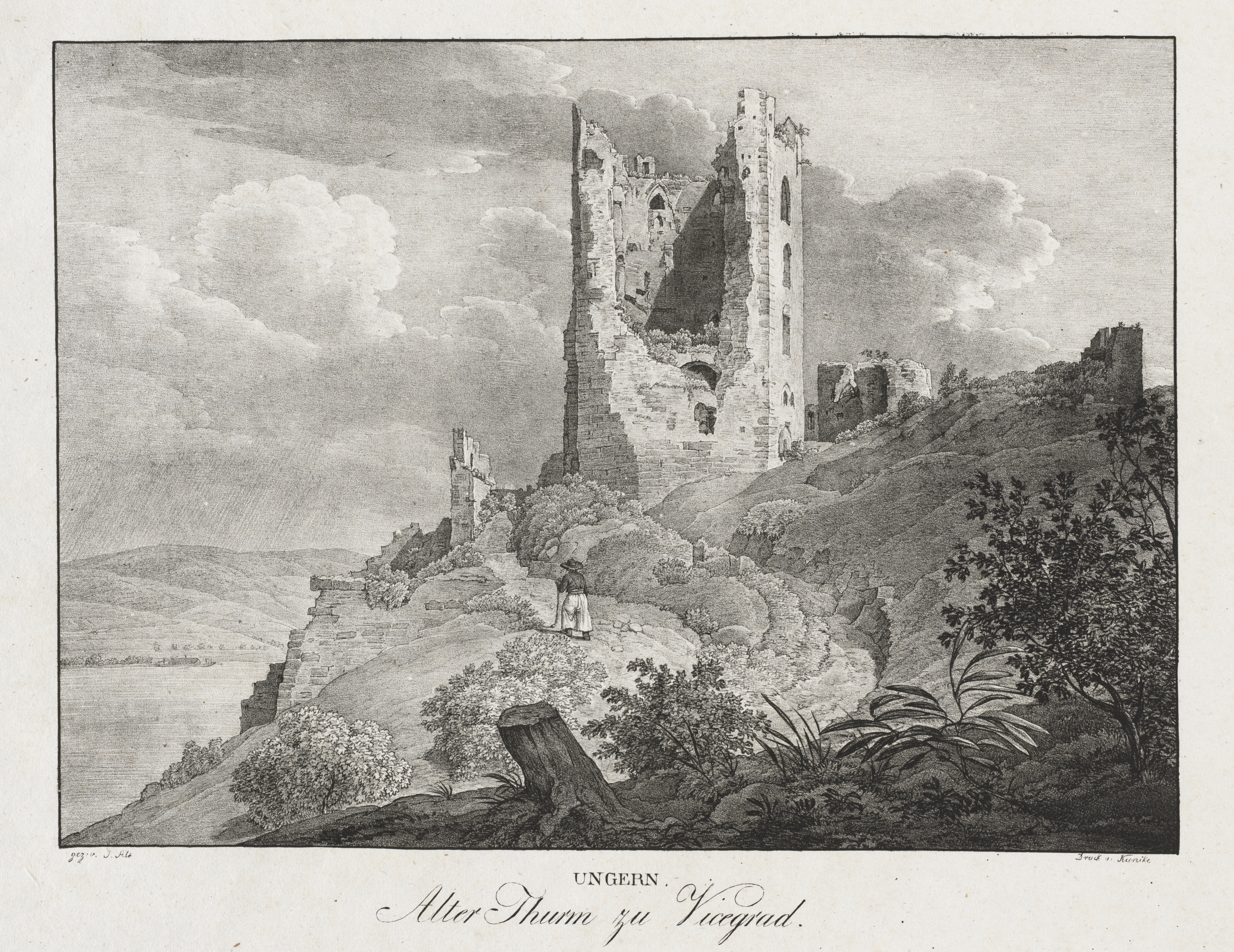 Black and white drawing of a ruined castle on top of a hill. The castle has tall walls and towers in various states of disrepair. A woman in a long dress and hat on a path looking at the castle. Trees and bushes in the foreground. A body of water and more hills in the background. Cloudy sky. Text at the bottom reads "Ungern. Alter Thurn zu Vicegrad."