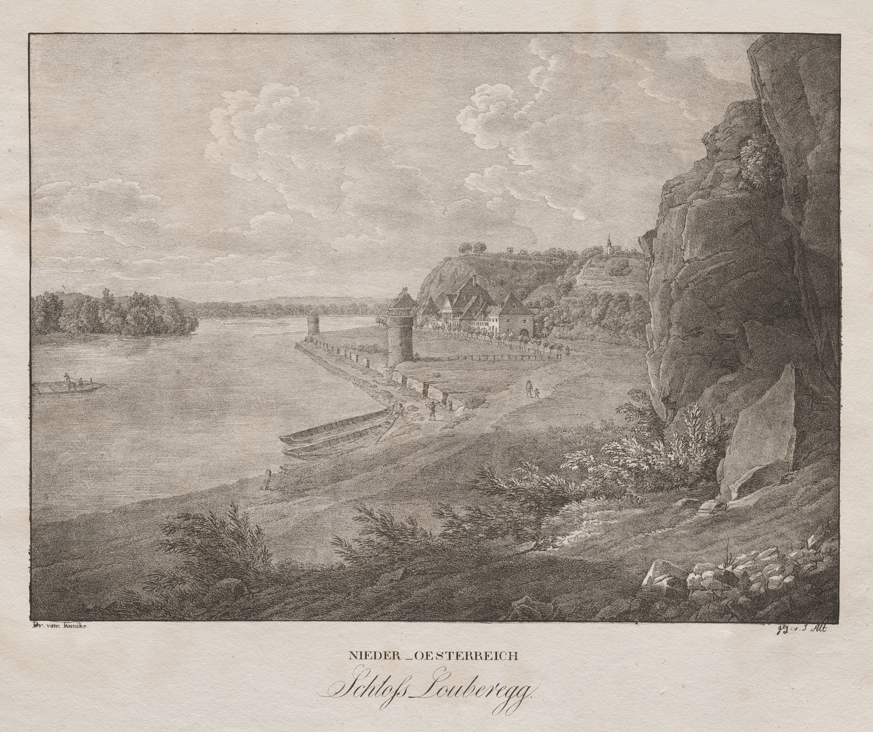 Black and white landscape drawing of a castle and river. The castle is situated on the right bank of a river. The river is on the left side of the image. There are trees on the left bank in the distance. On the right bank, a tall rocky cliff slopes down to the river. The castle has multiple buildings. There are people on the right bank. The sky has large white clouds. The image has a thin black border. The image is labeled "Nieder-oesterreich, Schloss Louberegg" and "by Jakob Alt".