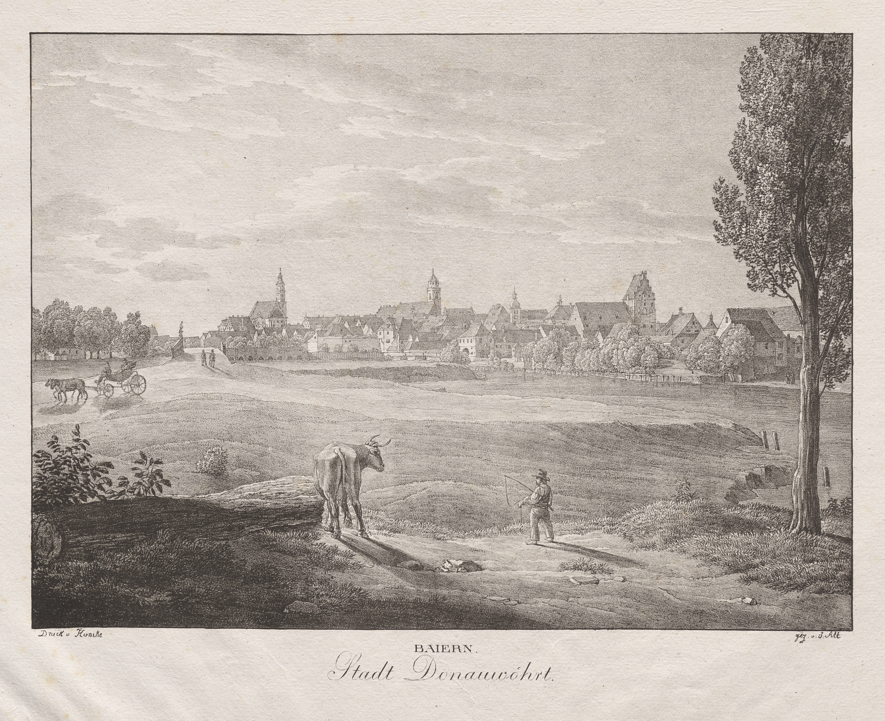 Black and white illustration of a town. The town has many buildings with steeply pitched roofs in a variety of shapes and sizes. The town is in the background across a body of water. In the foreground on the left is a bull on a dirt path with a man on the right of it. The man on the right holds a long object. On the left, a horse-drawn carriage travels on a path. There are trees on the right and left. The sky has many clouds. The illustration is surrounded by a thin black line. The illustration sits on a beige background. The title is written in black text at bottom center.