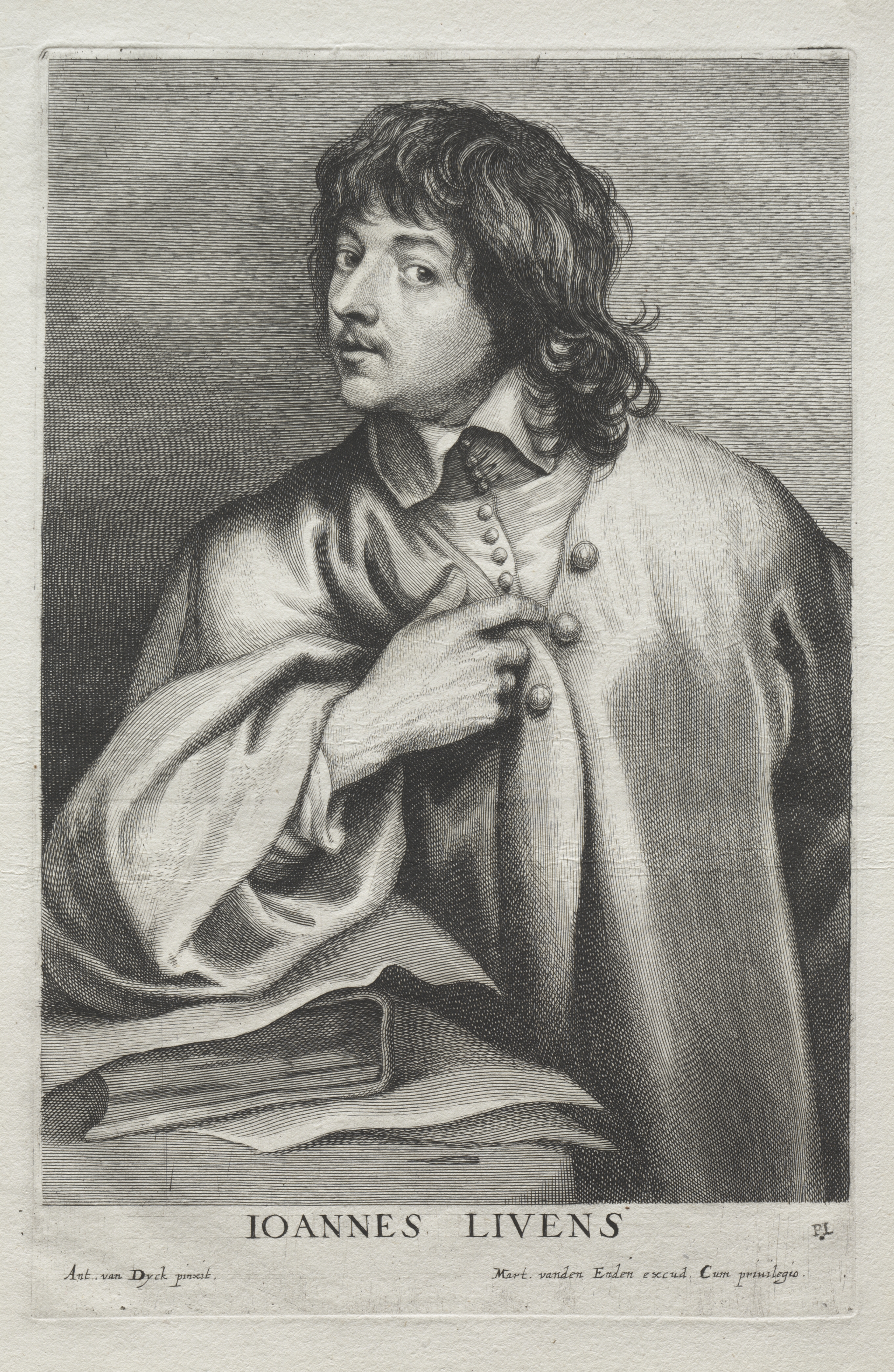 Black and white portrait of a man with shoulder-length hair wearing a wide-collared and buttoned shirt under a wide-sleeved top, sitting with one arm on a surface and the other raised to adjust his clothing; a book under his arm; against a gradient background; text at bottom center reads "IOANNES LIVENS".