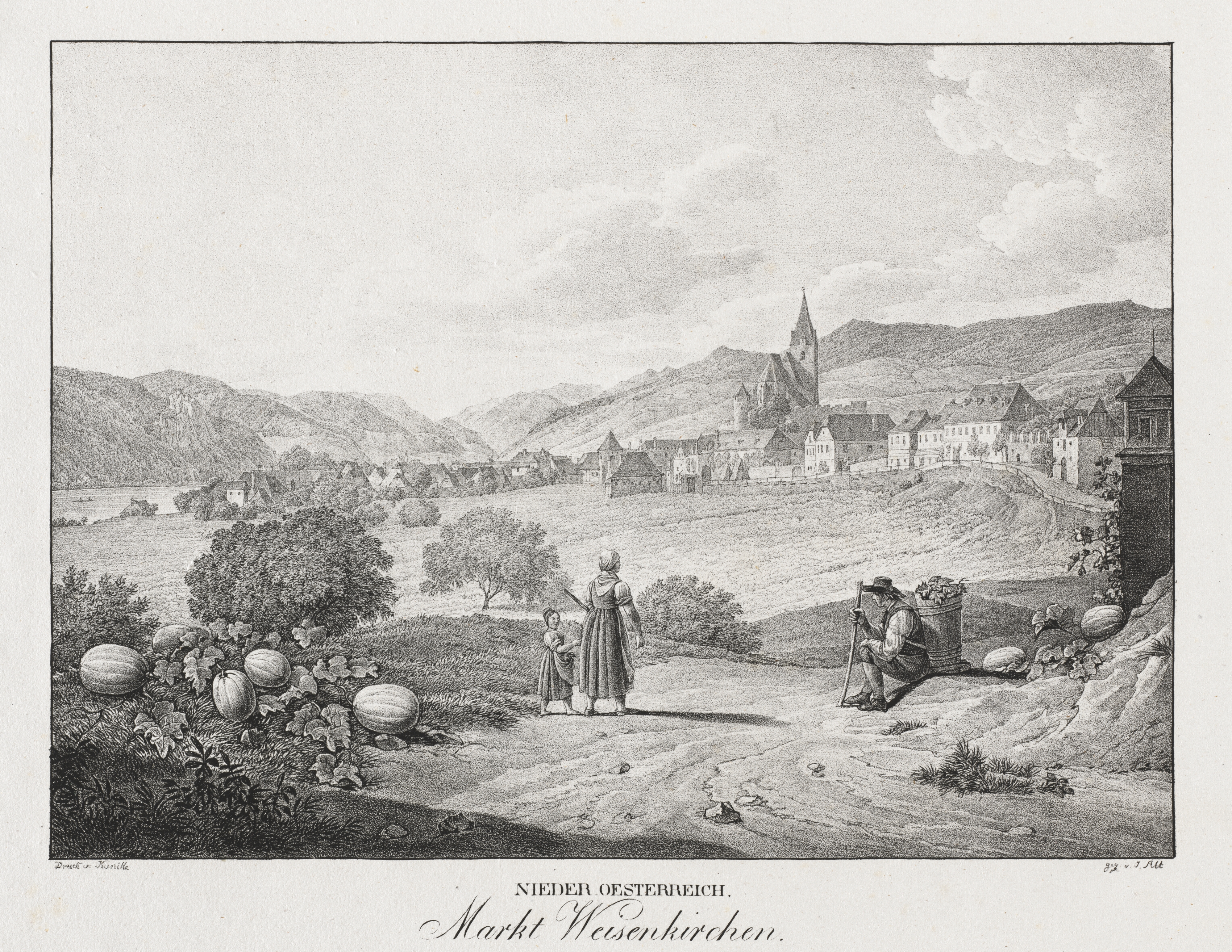 Black and white landscape drawing. A dirt path leads to a town in the distance. A woman and child stand on the path, looking towards the town. The woman wears a long dress. A man sits on the right side of the path, leaning on a walking stick. He wears a hat and vest. There are melons and other plants on the left side. A field and trees are to the left and right. A mountain range is in the background. Houses and a church are in the background. The sky has clouds. The title at the bottom reads "Nieder-oesterreich, Markt Weisenkirchen". The artist is Jakob Alt.