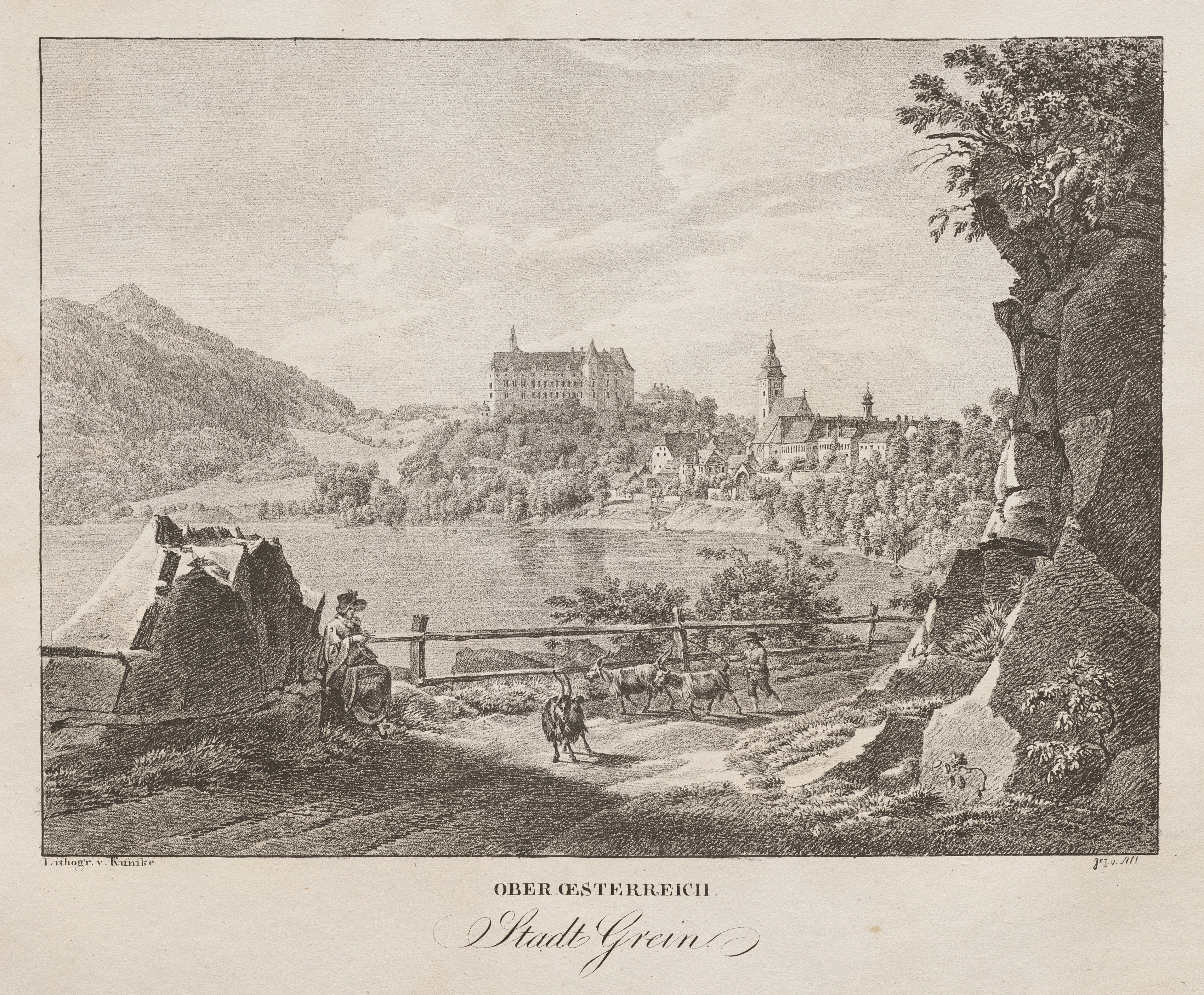 Black and white drawing of a river with a town on the other side of it; a man leads oxen down a dirt road; a woman sits on a stone on the left side; wooded hills on both sides; large castle sits on hillside above town; church steeple to right of castle; wooden fence runs across center of image; road curves to lower right; rocky cliff on right edge; trees on top of cliff; cloudy sky; text below image.