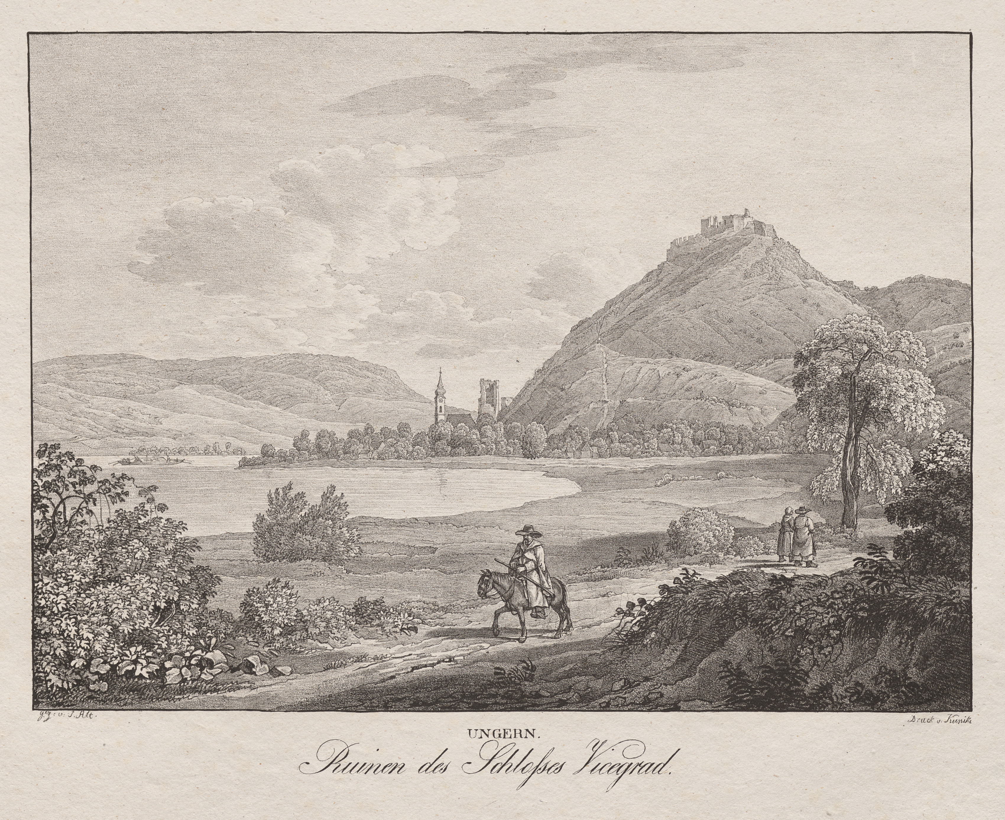 Black and white landscape drawing or print. A body of water runs horizontally through middle. Mountains on horizon. A mountain with a castle on top on right. A church steeple on left. Trees on both sides in foreground. A man on horseback on a road on the bottom center. Two people stand on road on the right. Caption underneath in a foreign language.