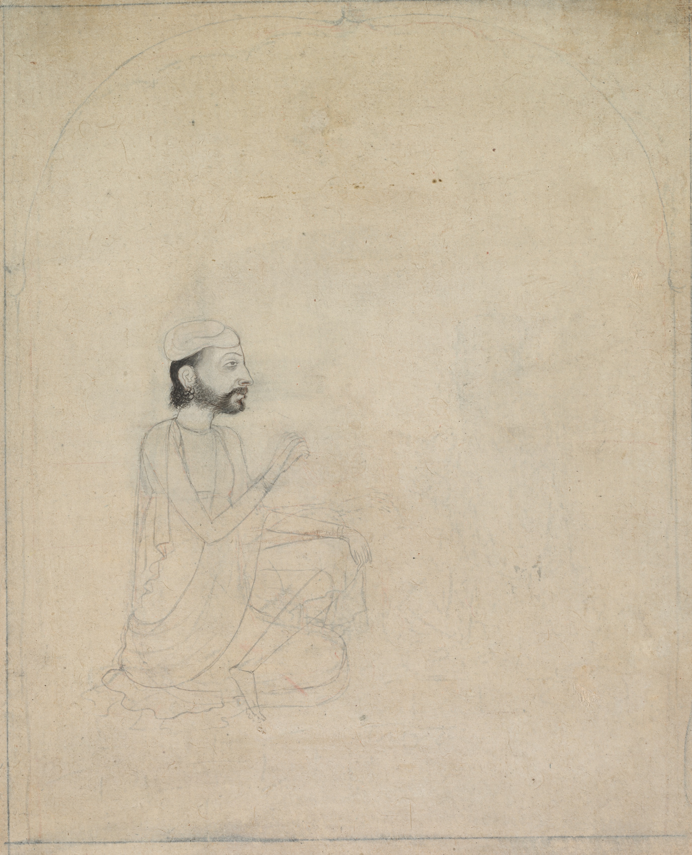 The image depicts a portrait of a seated man. The man has dark hair and a beard and mustache. He wears a white cap and a long-sleeved tunic. He sits on the floor with his legs crossed and his right hand raised. He appears to be seated on the floor. The background is a light brown color, with some darker brown spots and lines. The drawing appears to be a sketch or study, with faint lines and minimal color. The overall style is simple and traditional. The artist's rendering of the image is minimalistic. The image seems to portray an older man.
